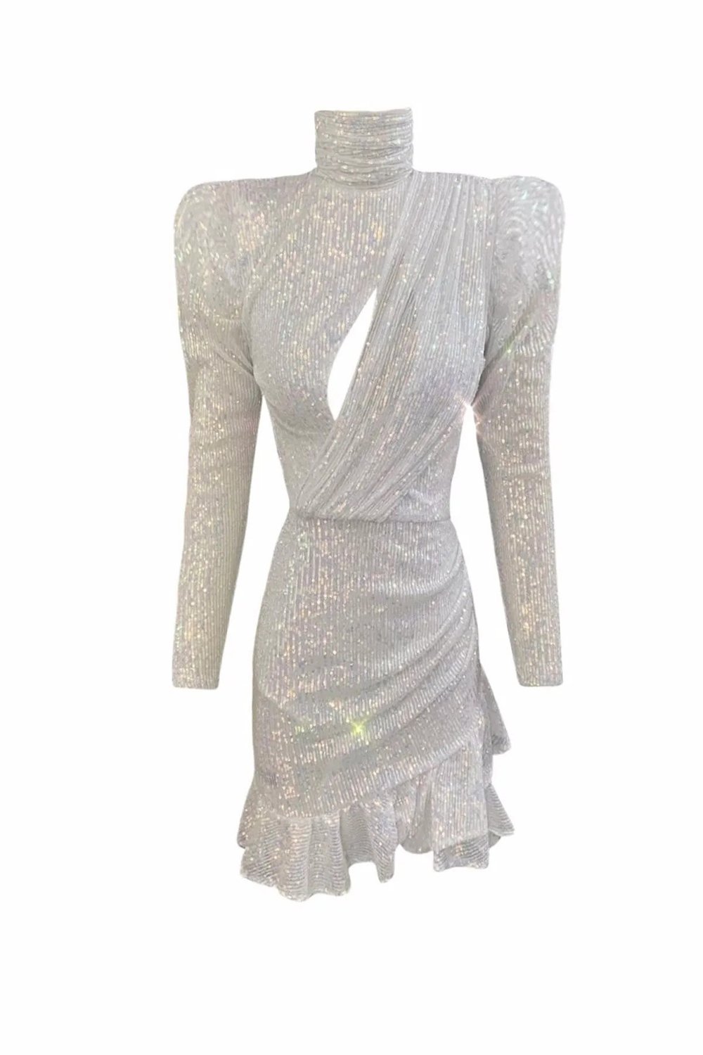 Hologram efektli beyaz payetlerle tasarlanan bu mini elbise, fırfır detayıyla feminen bir hareket kazanırken, ışıltısıyla her ortamda dikkatleri üzerine çeker. Likralı yapısı vücudu zarifçe sarar, astarlı iç yapısı ise iç göstermeden konforlu bir kullanım sağlar. Parti, davet ve özel gecelerde masalsı ama modern bir şıklık arayanlar için ideal bir parçadır.