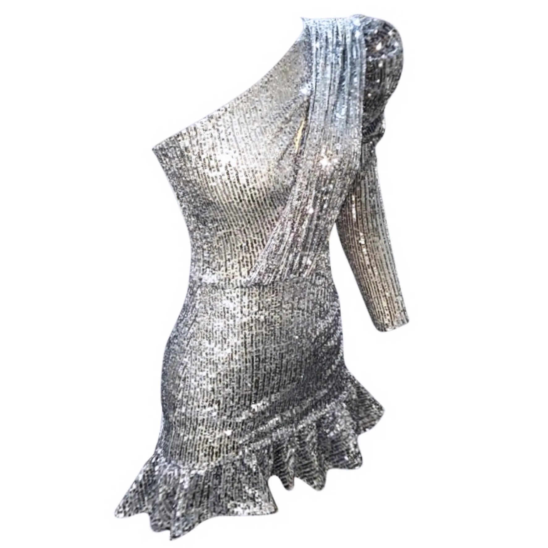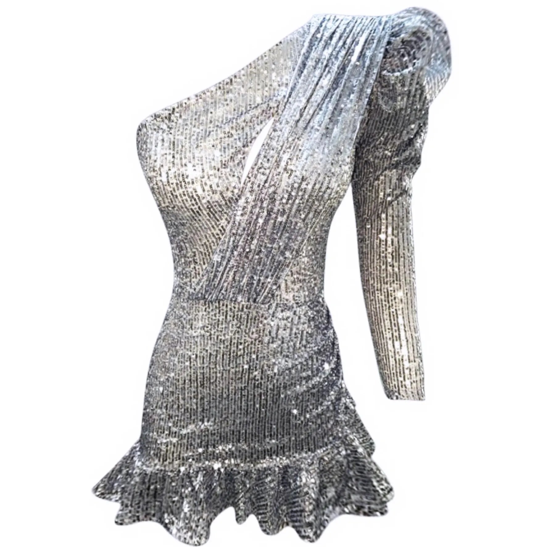 Gümüş / Bej Payetli Tek Kol Fırfırlı Mini Elbise