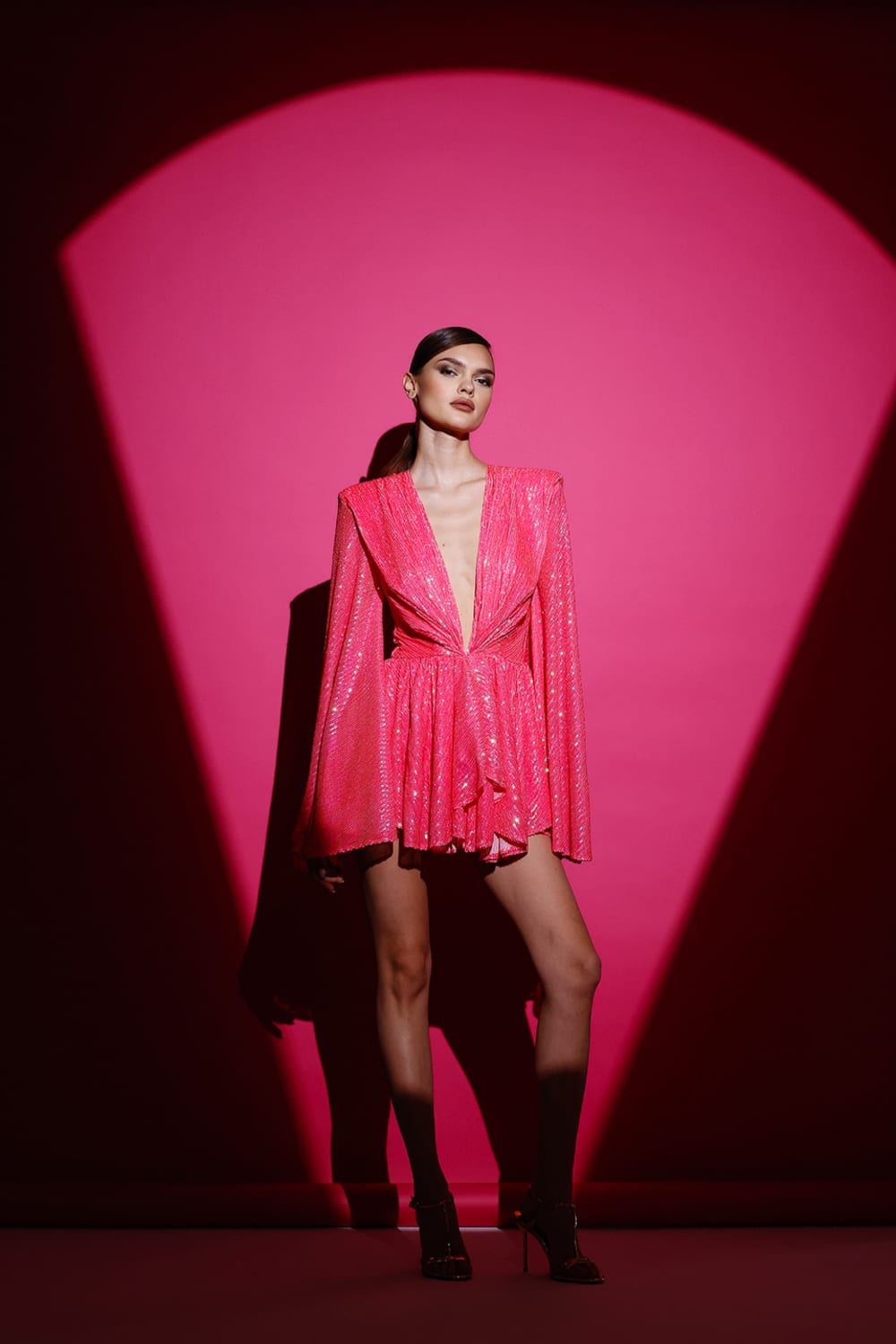 Işıltılı pembe payet kumaştan üretilmiştir.