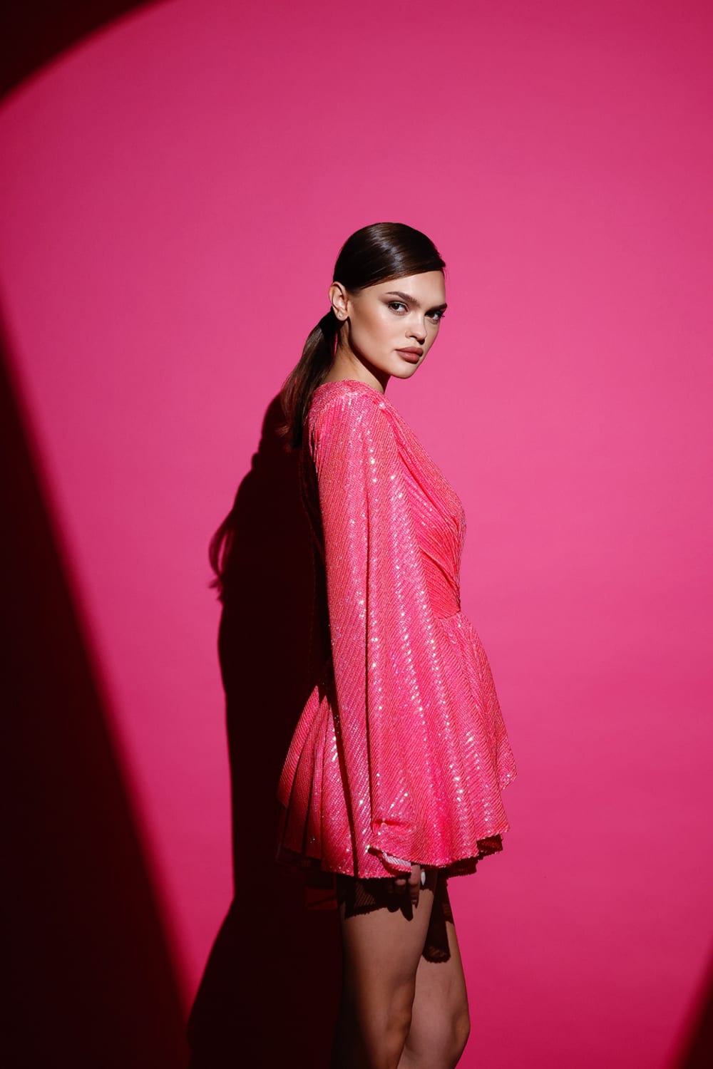 Pembe Payetli Geniş Kol Detaylı Elbise