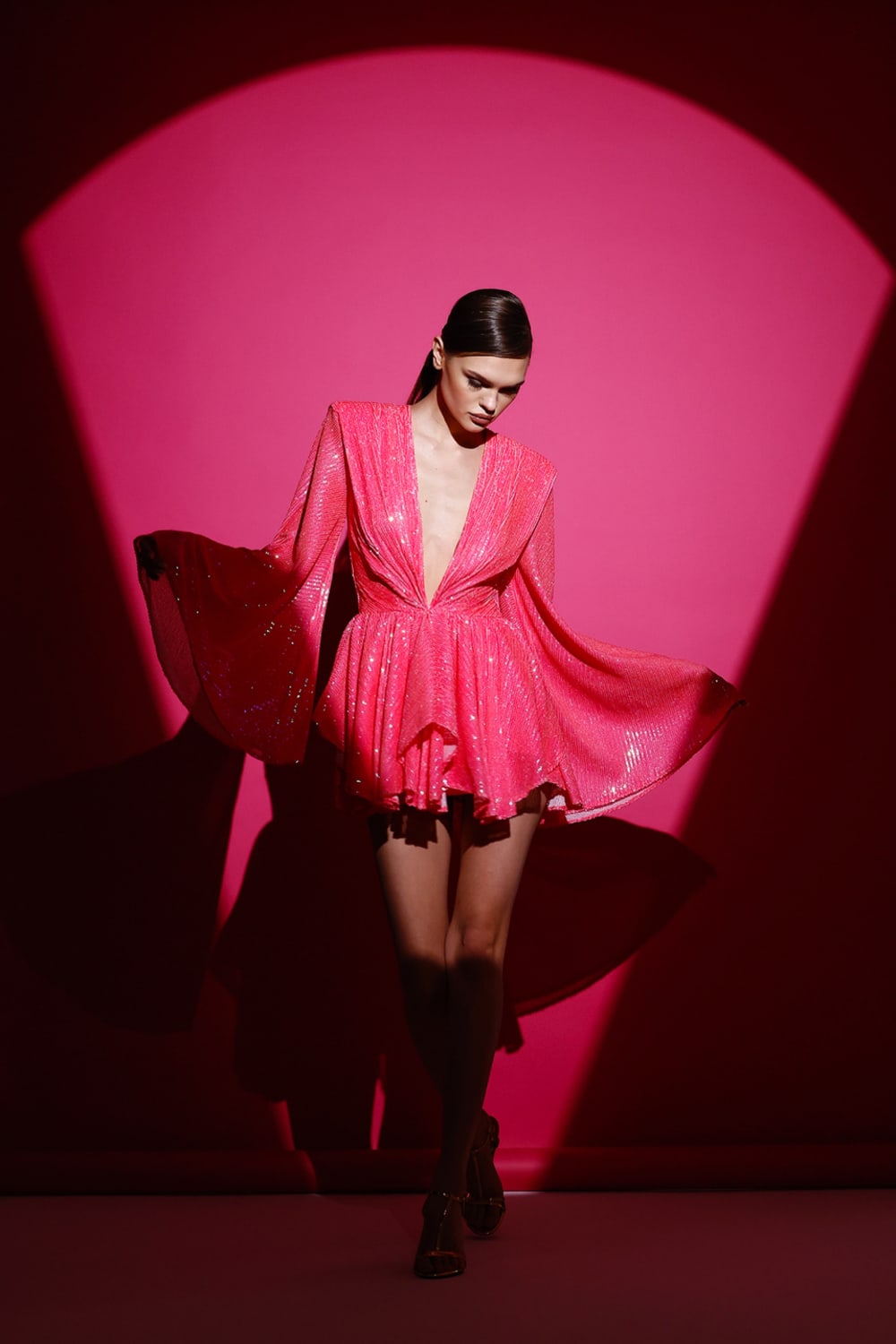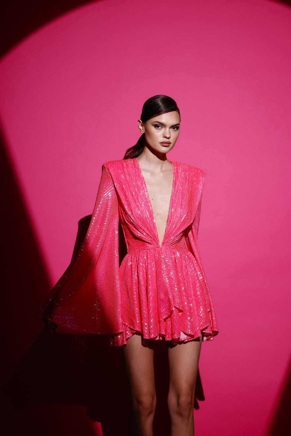 Geniş kol detayı ve mini boy kesimiyle özel davetlerde feminen ve dikkat çekici bir siluet sunar.