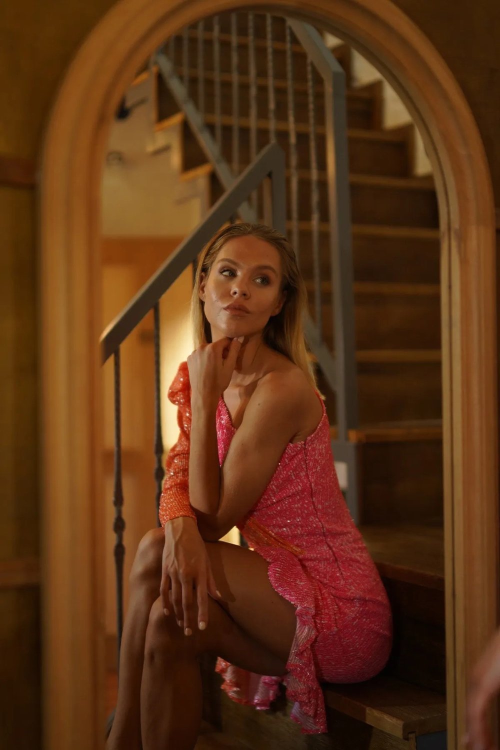 Pembe ve turuncu renk bloklarının enerjik ışıltısını bir araya getiren bu tek omuz mini elbise, modern ve dikkat çekici bir siluet sunar. Astarlı yapısı iç göstermeden konfor sağlarken, payet dokusu ışığı güçlü şekilde yansıtarak etkileyici bir duruş yaratır. Kutlamalar, özel davetler ve gece stilleri için ideal bir statement parçadır.