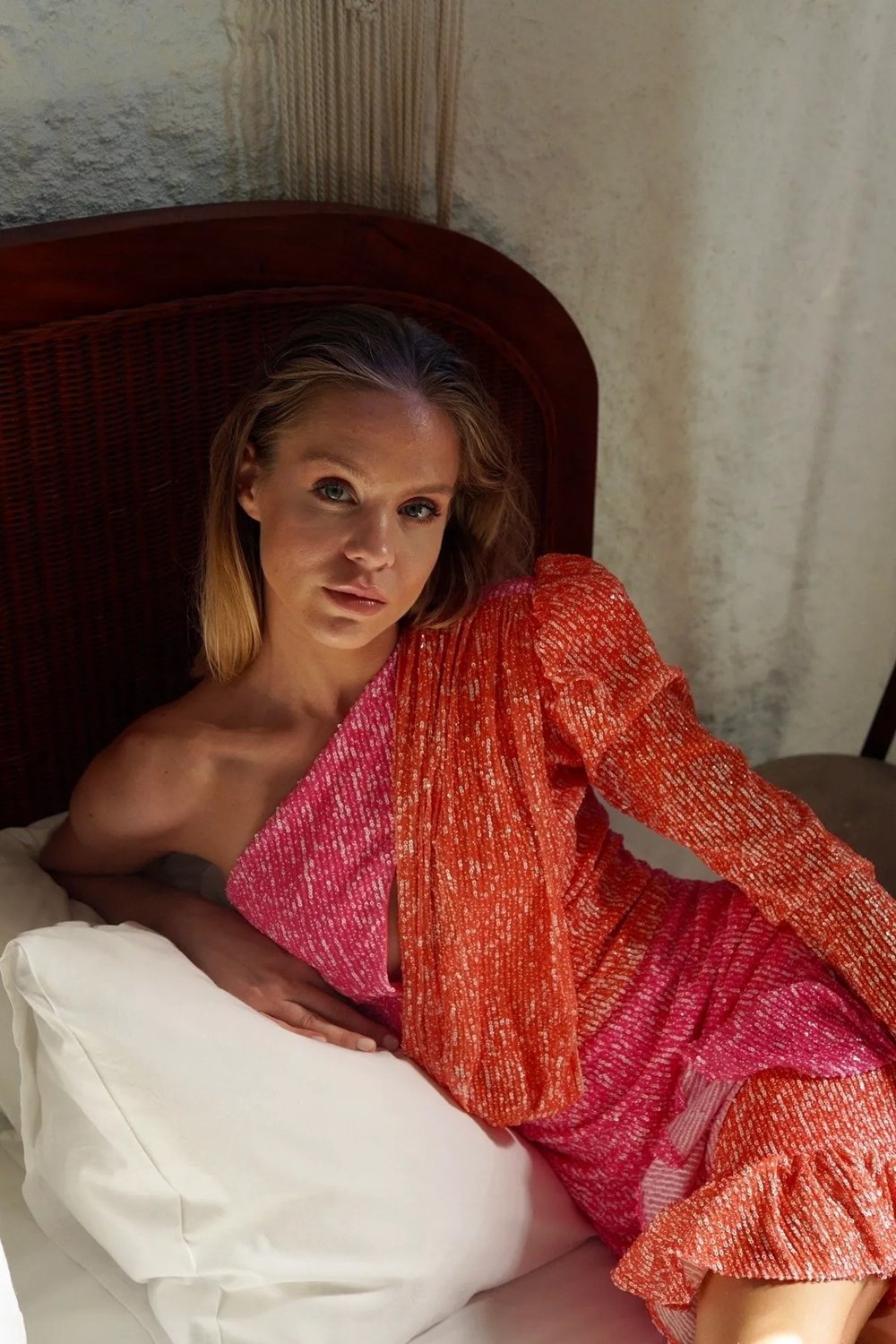Pembe Turuncu Payetli Renk Bloklu Tek Omuz Elbise