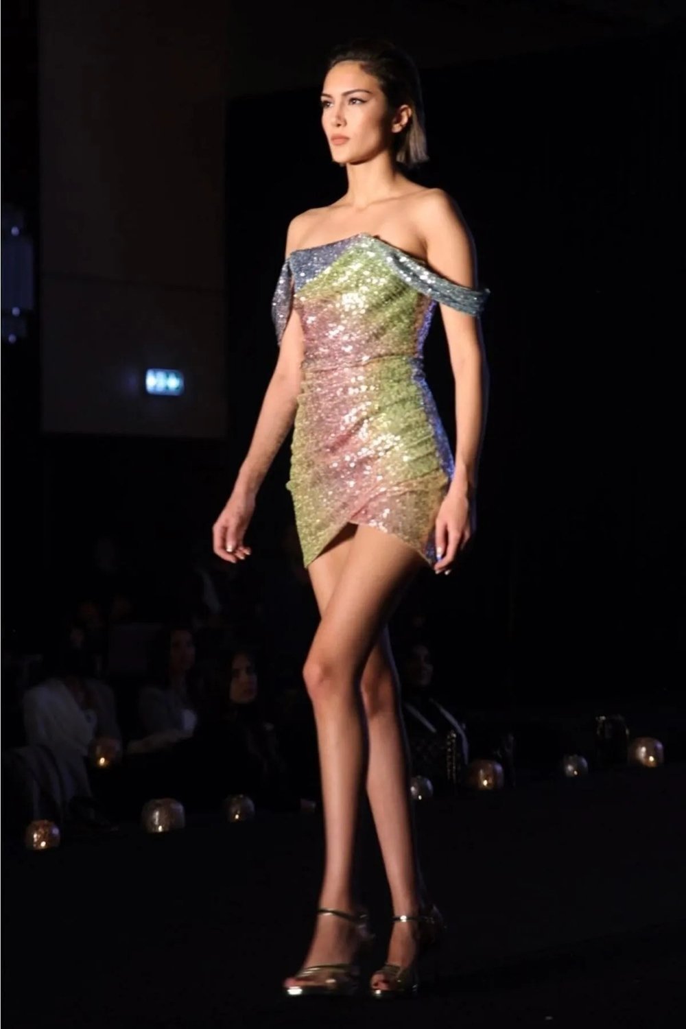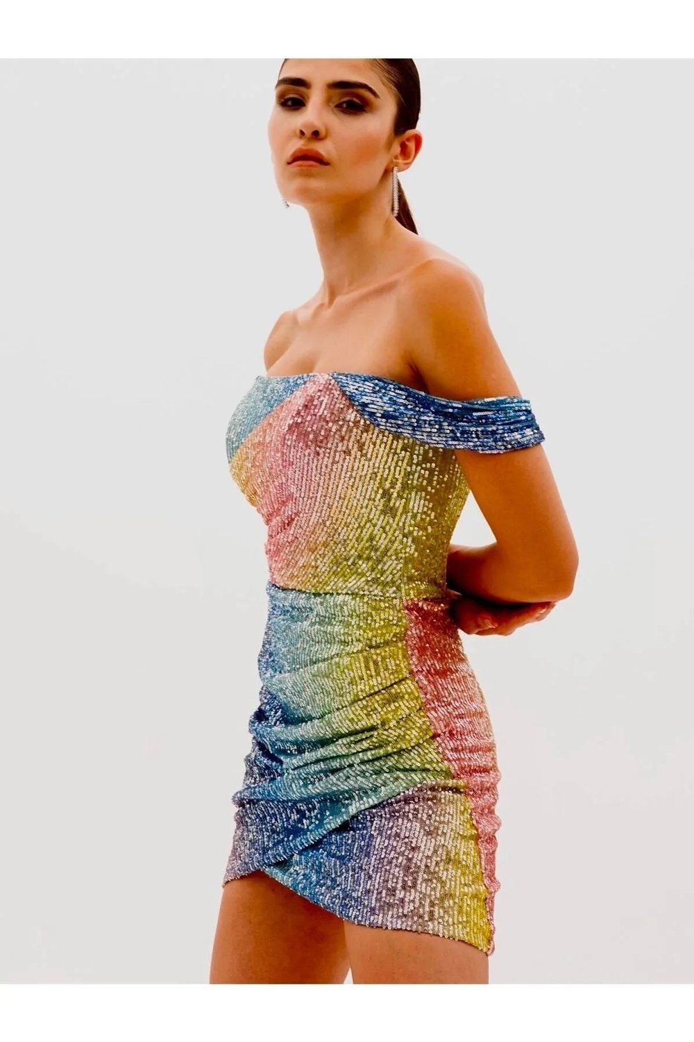 Enerjisi yüksek rainbow payet dokusuyla göz alıcı bir şıklık sunan bu mini elbise, üst bedenindeki korsaj formuyla silueti toplar ve vurgular. Mini boy kesimi hareketli ve modern bir görünüm yaratırken, cesur ve feminen bir duruş kazandırır. Parti, kokteyl ve özel davetlerde sahnenin yıldızı olmak için mükemmel bir seçimdir.