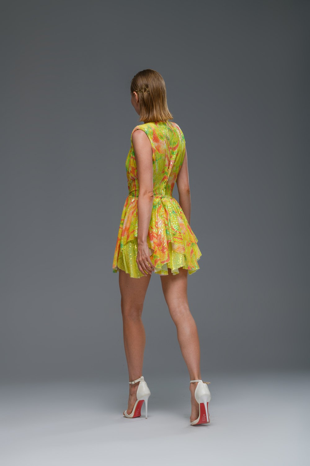 Sarı Payetli Desenli Kolsuz Mini Elbise