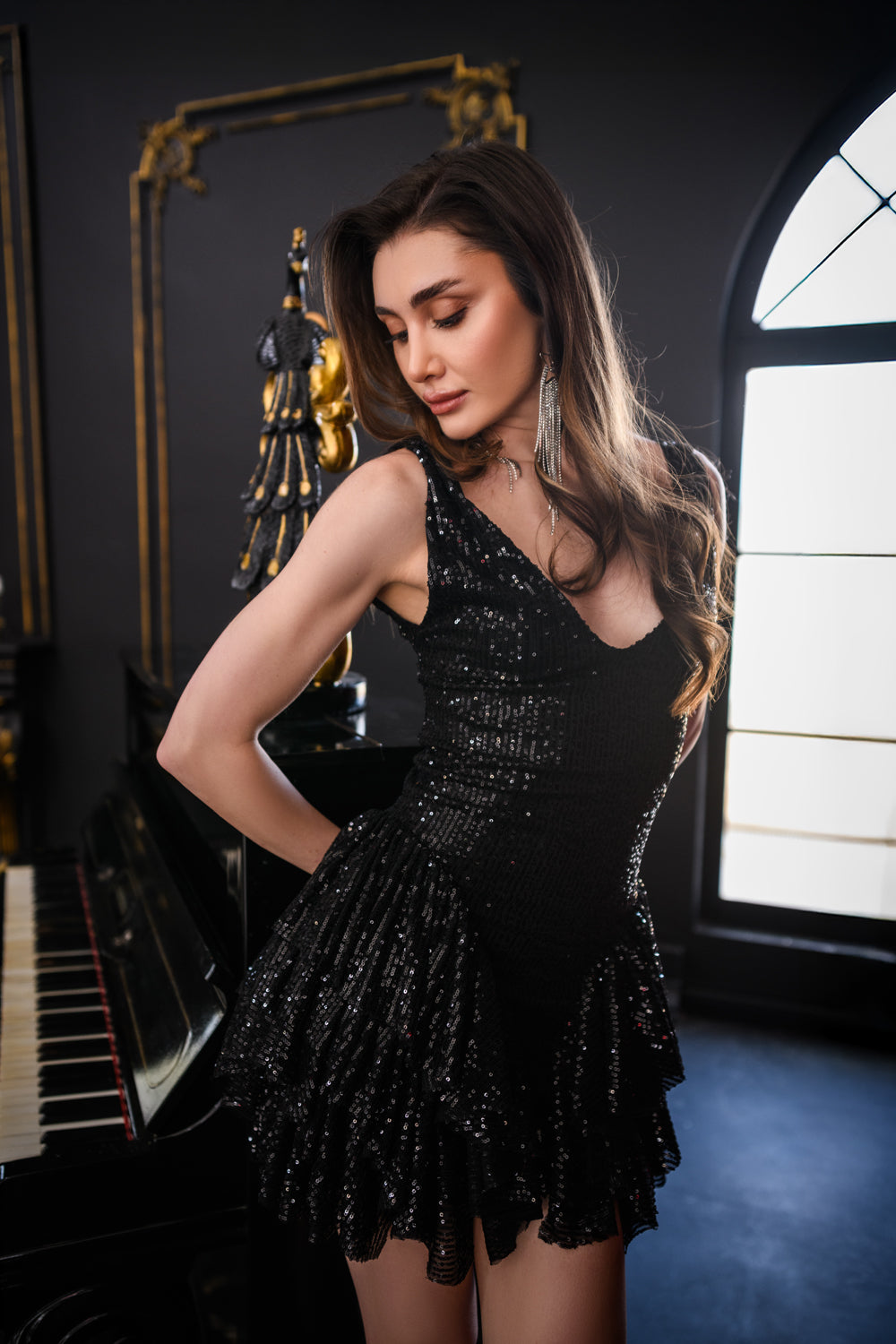Işıltılı siyah payet yüzeyi ve feminen volan detayı ile dikkat çeken bu mini elbise, askılı formu sayesinde zarif bir siluet sunar. Astarlı yapısı iç göstermeden konforlu bir kullanım sağlar. Özel davetler, kutlamalar ve gece stilleri için ideal bir tercihtir.