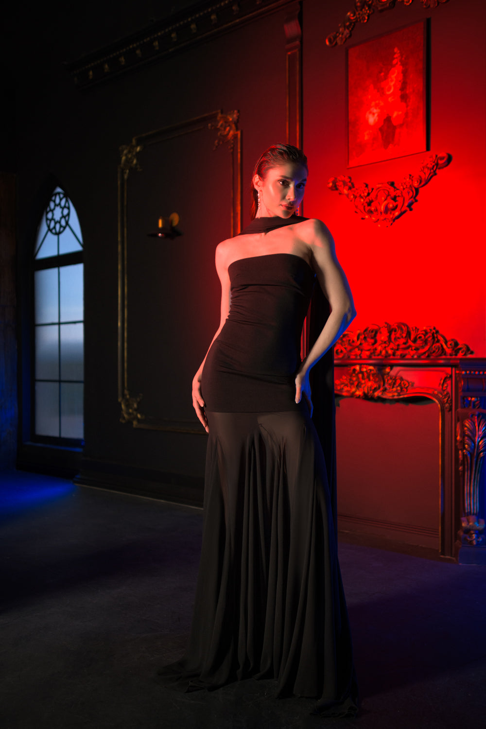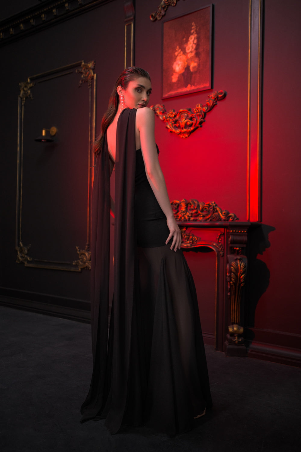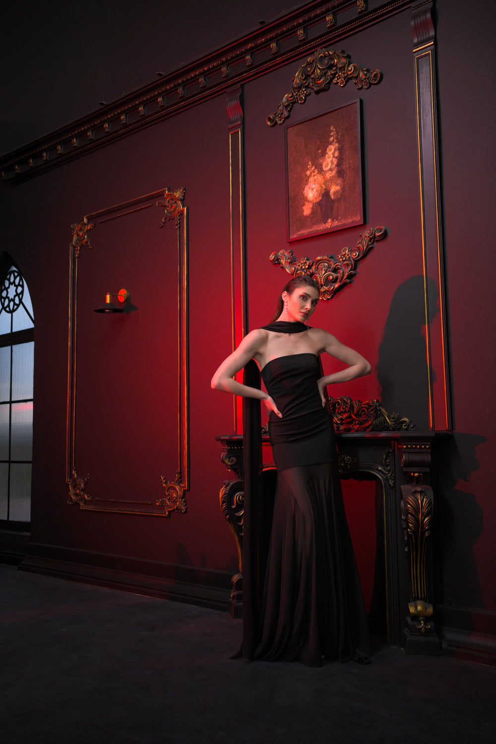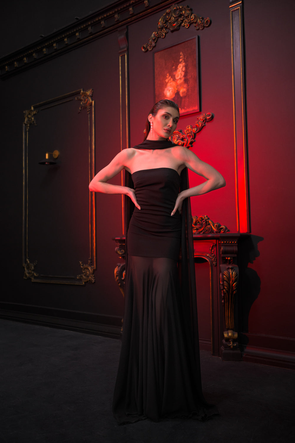 Zarif straplez yakası ve akıcı şifon etek detayıyla sofistike bir gece silueti sunar. Uzun formu özel davetlerde etkileyici bir duruş sağlarken, astarlı yapısı sayesinde iç göstermez ve konforlu bir kullanım sunar. Şehir şıklığından kırmızı halı gecelerine kadar zarafetle eşlik eder.