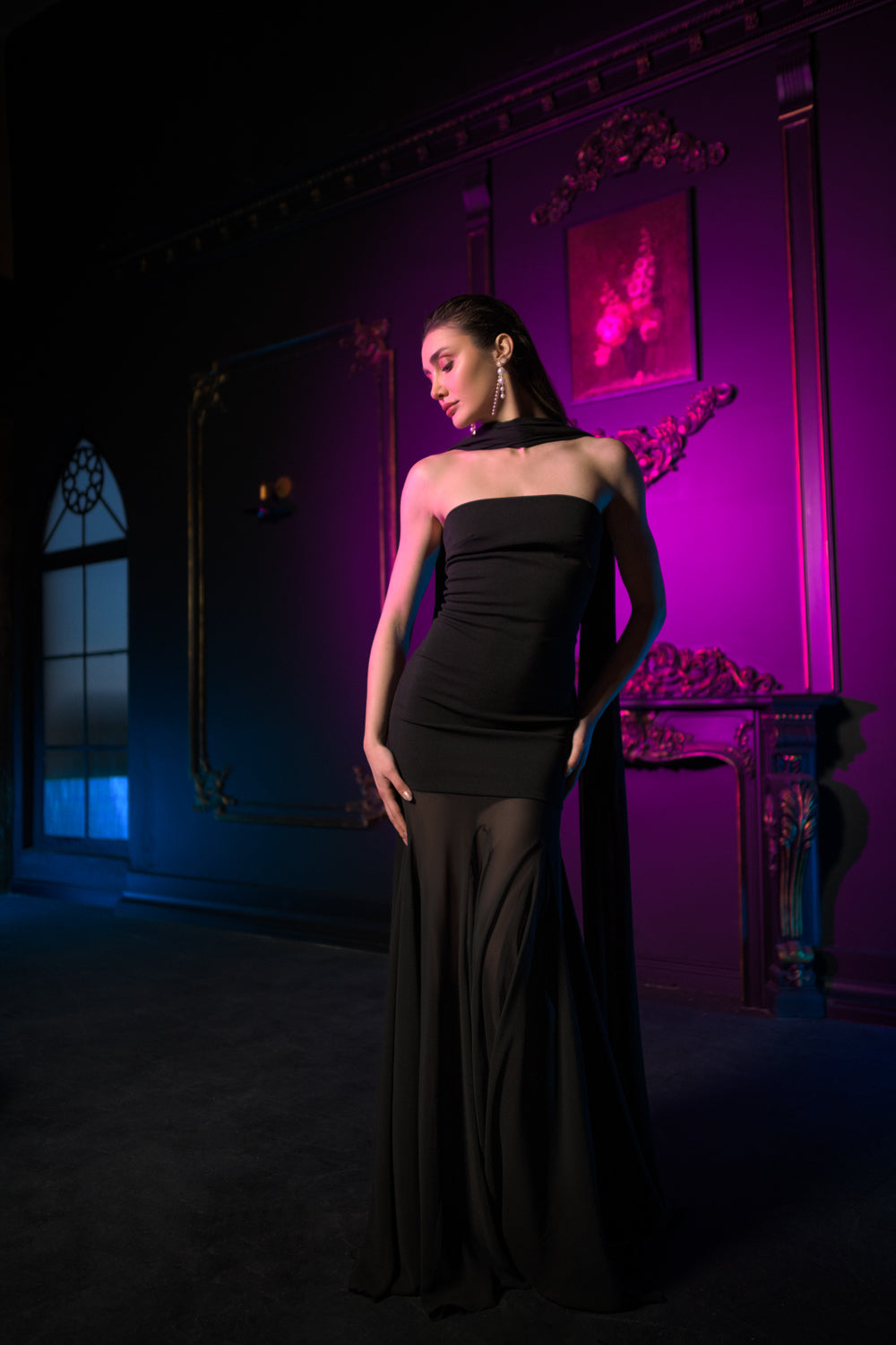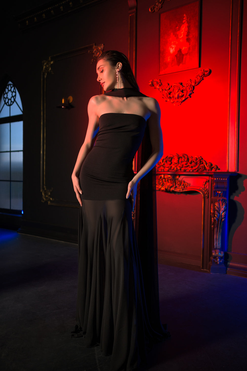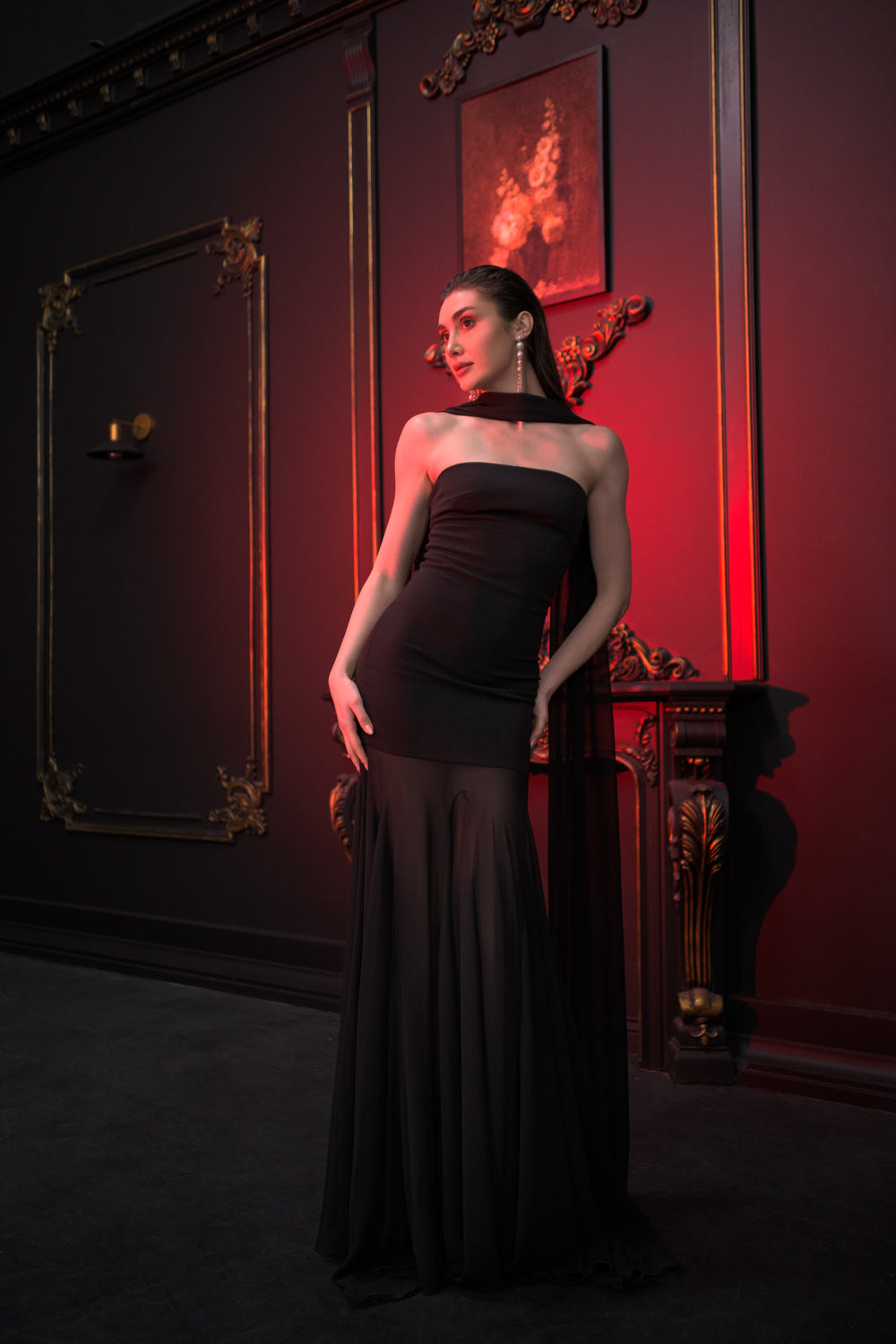 Siyah Straplez Şifon Etek Detaylı Uzun Elbise