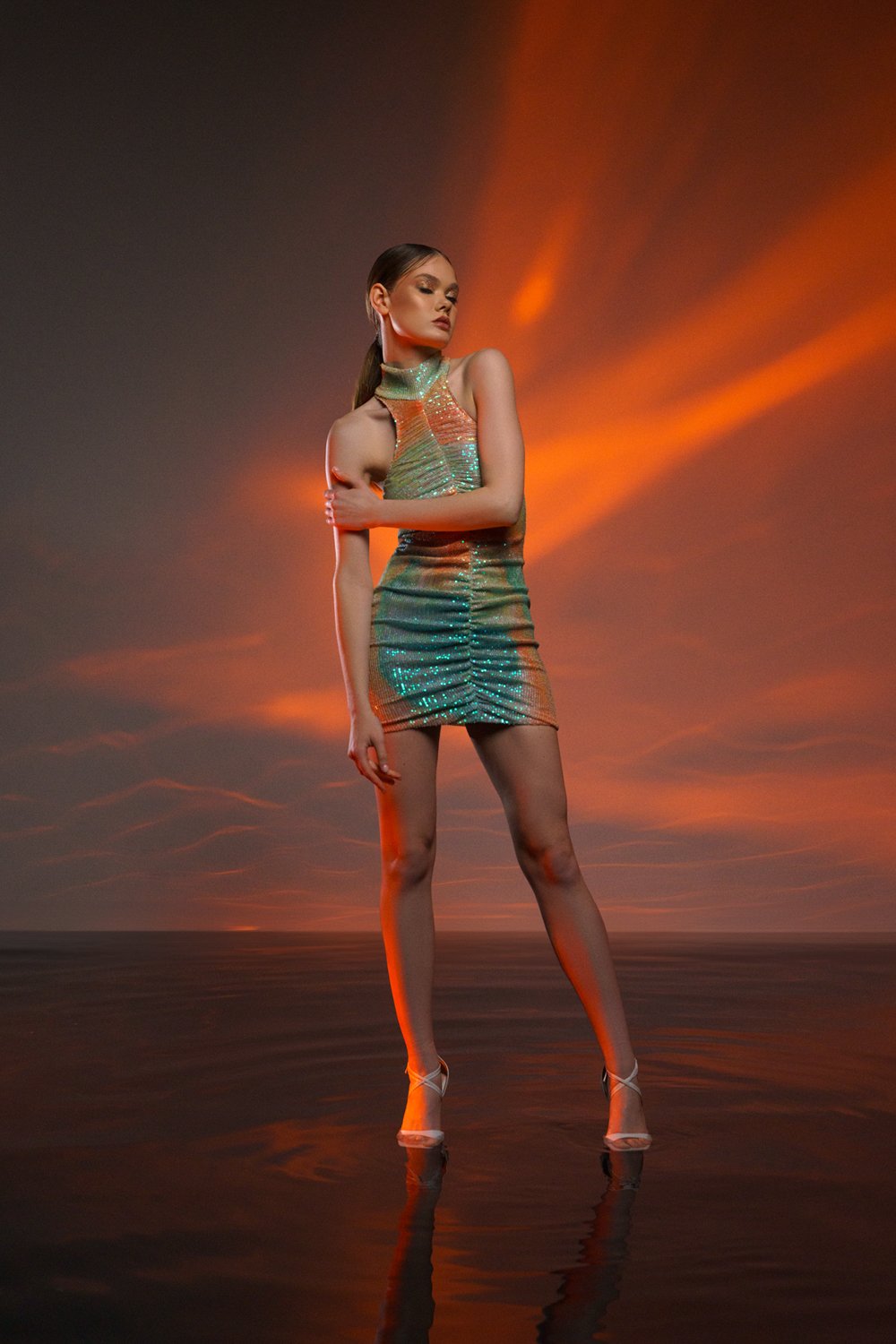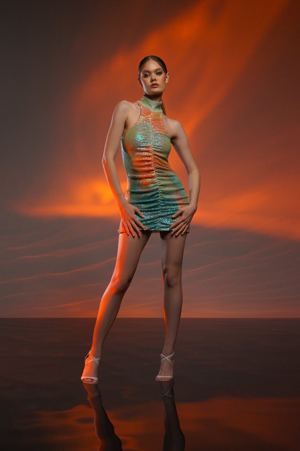 Yeşil Turuncu Payetli Batik Desen Mini Elbise