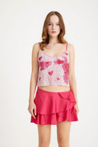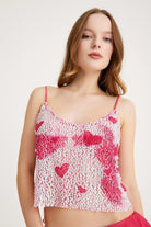 Pullu ve kalp süslemeli bluzla ışıltılı bir ifade yaratın. Şakacı ve cilveli tasarımı, eğlenceyi seven bir ruhun özünü yakalar; dışarıda geçireceğiniz bir gece veya parlamak istediğiniz özel bir gün için mükemmeldir.