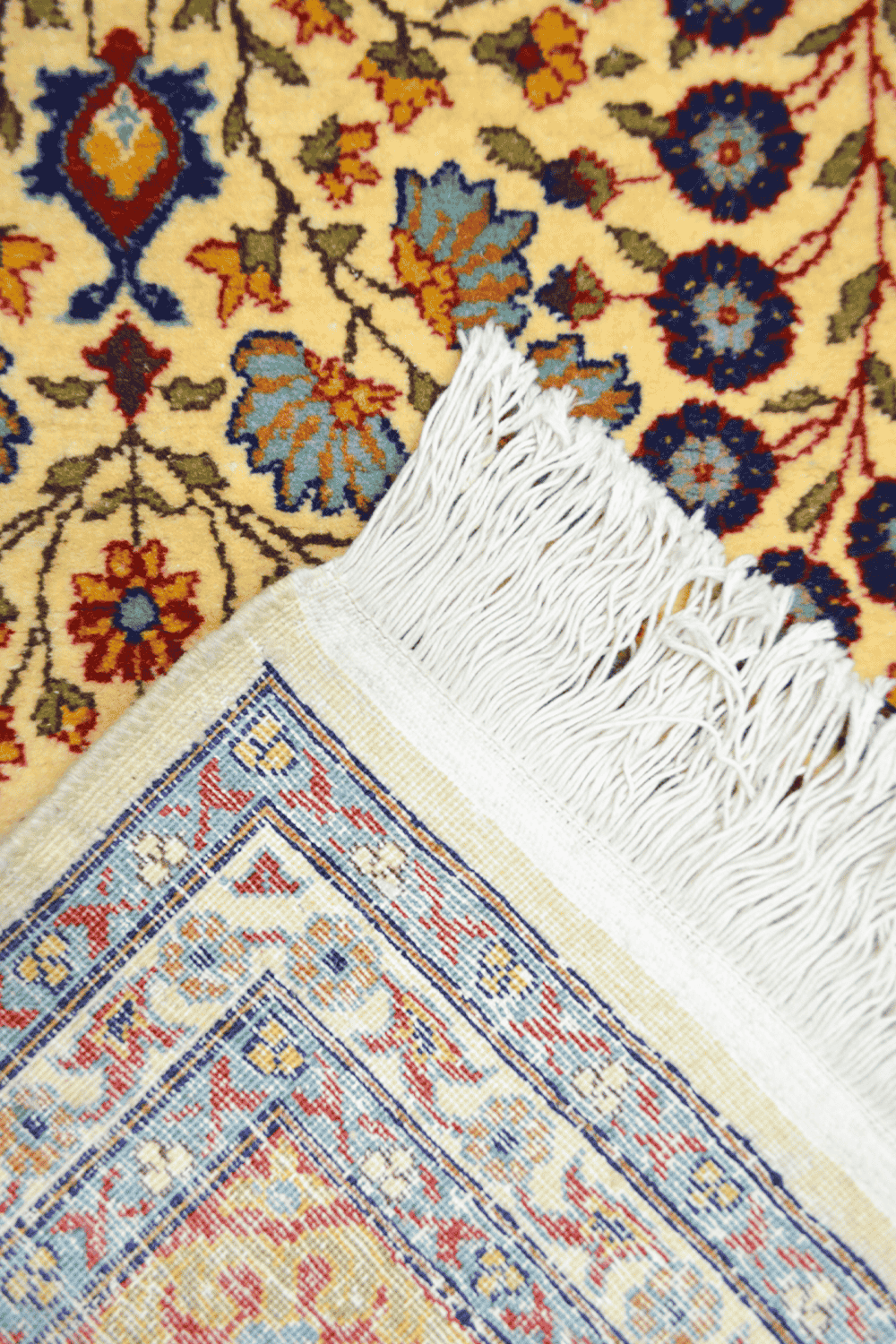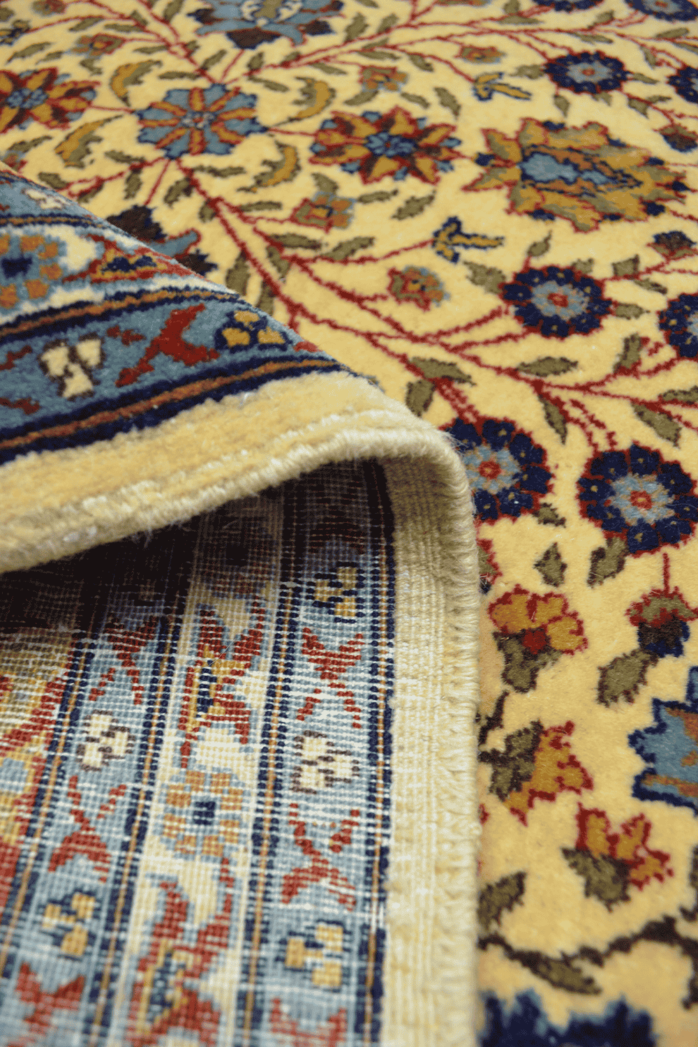 Bu Hereke Halısı, orijinal Sümerbank üretimi olup, pamuk saçak üzerine yün ipliklerle el dokuma tekniğiyle hazırlanmıştır. 60×60 düğüm kalitesi ve metrekarede 360.000 ilmek sıklığı, halının ince işçiliğini ve yüksek dokuma kalitesini ortaya koyar. Klasik Hereke estetiğinin en bilinen desenlerinden biri olan Yedidağın Çiçeği, bu halıda zarif bir bej tonuyla birleşerek sofistike ve zamansız bir görünüm sunar.