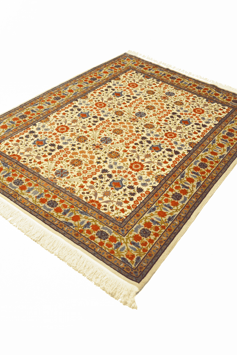 Bu orijinal Sümerbank Hereke halısı, pamuk saçak üzerine yün dokuma tekniğiyle üretilmiştir. 60×60 düğüm kalitesi, ilmek yoğunluğu yüksek ve ince işçilikli dokuma yapısını gösterir. Krem, kırmızı ve lacivert renklerin kullanıldığı Yedi Dağın Çiçeği deseni, Hereke dokumacılığının karakteristik ve klasik motifleri arasındadır. 156x220 cm ölçüsü ile salon, oturma odası ve giriş alanlarında dekoratif ve kullanışlı bir seçenek sunar.