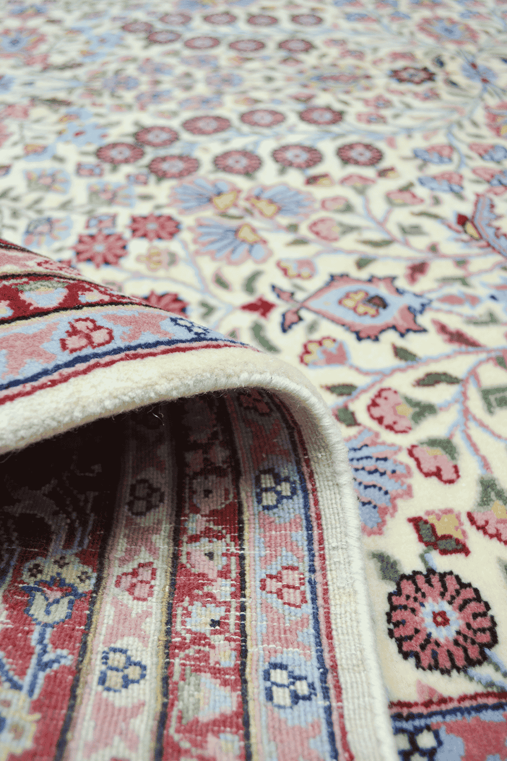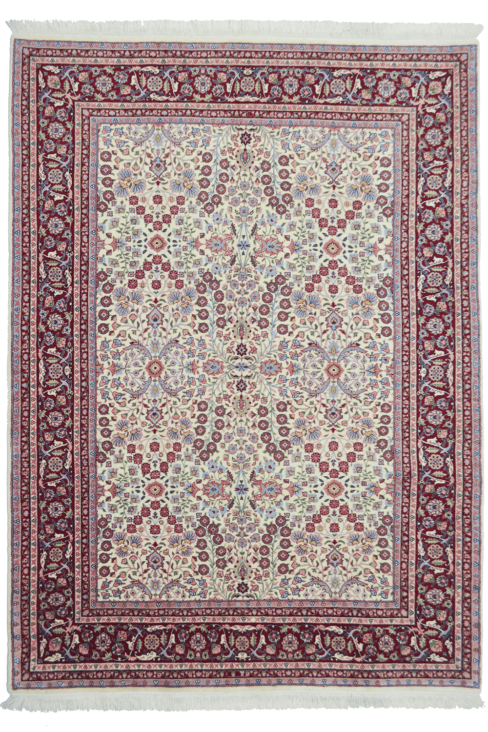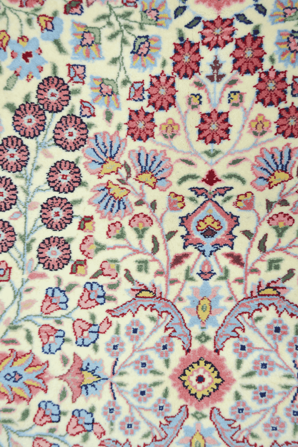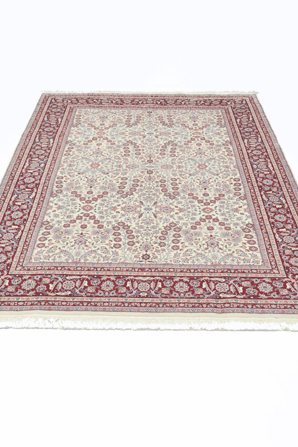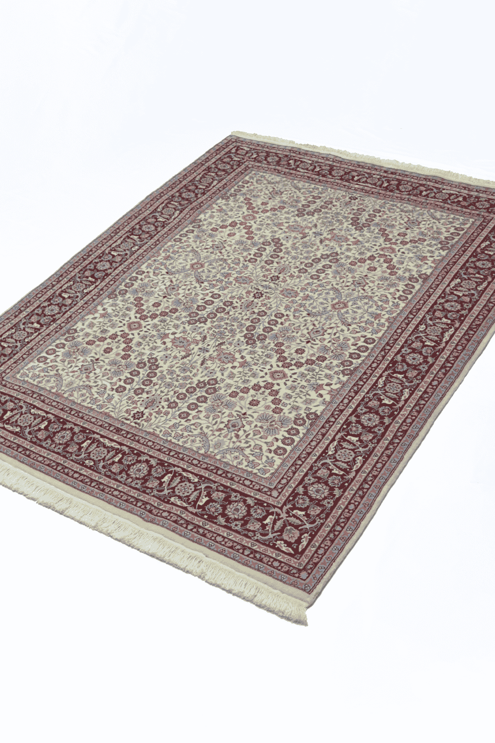 Bu orijinal Sümerbank Hereke halısı, pamuk saçak üzerine yün ipliklerle el dokuma tekniği kullanılarak üretilmiştir. 60×60 düğüm kalitesi, ince ve yoğun dokuma yapısını gösterir. Beyaz, pembe, açık mavi ve bordo renklerin kullanıldığı Yedi Dağın Çiçeği deseni, klasik Hereke tasarımlarının belirgin örneklerindendir. 170x232 cm ölçüsüyle salon, oturma odası veya geniş yaşam alanlarında estetik ve fonksiyonel kullanım sunar.