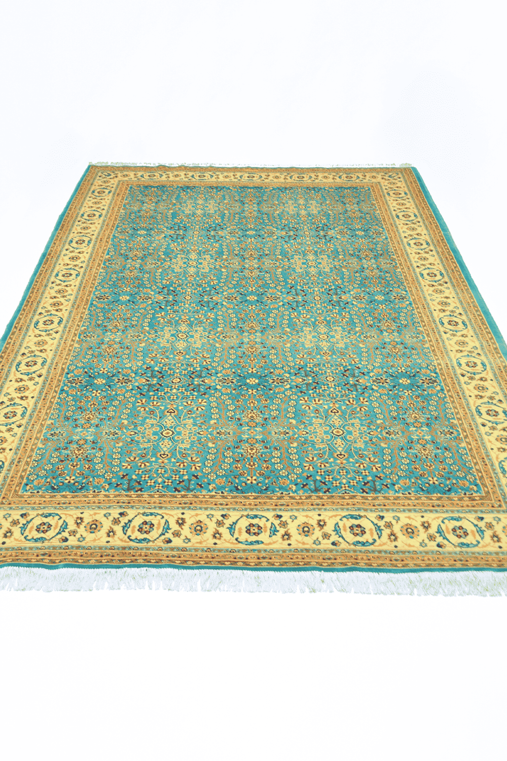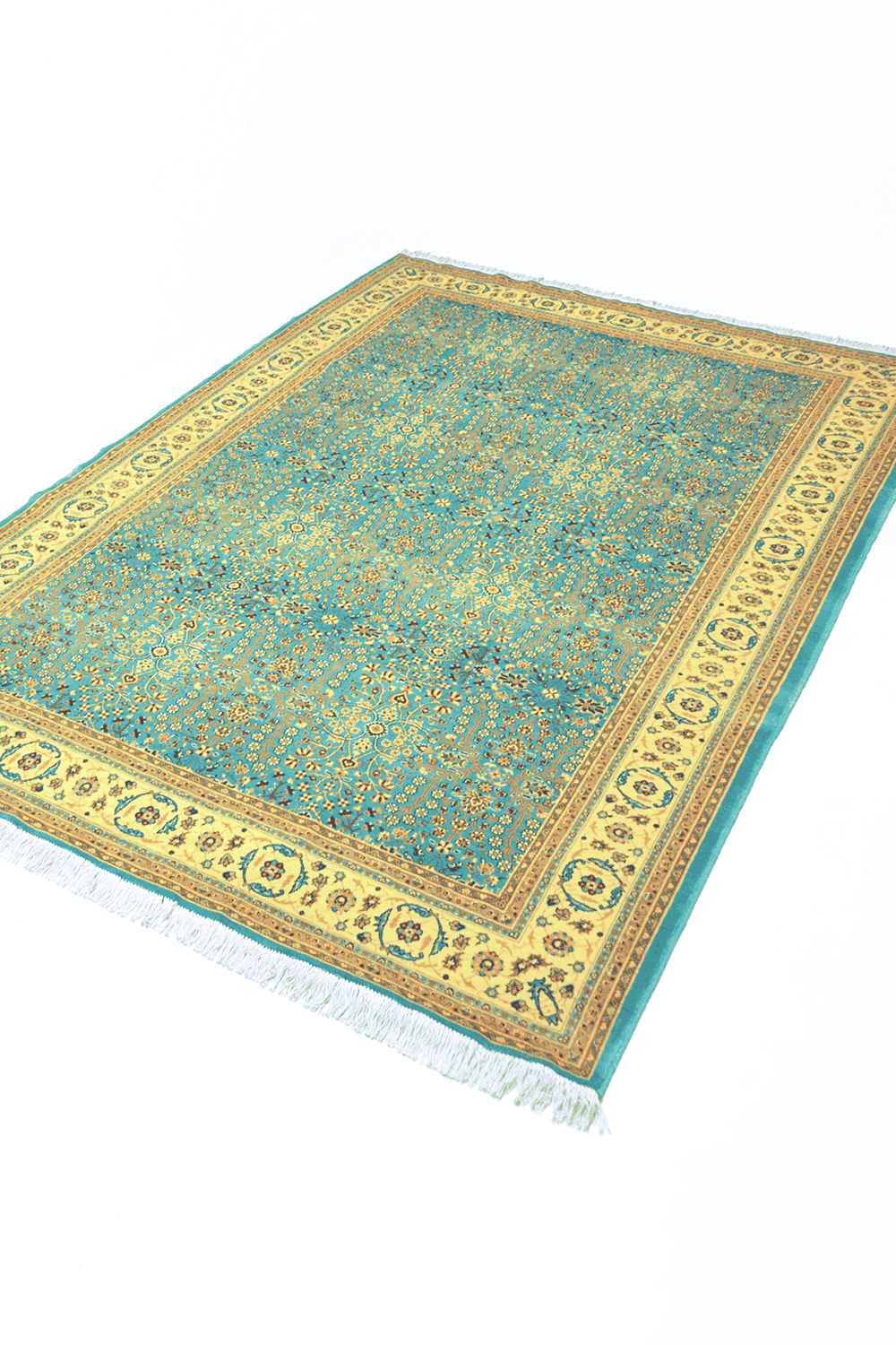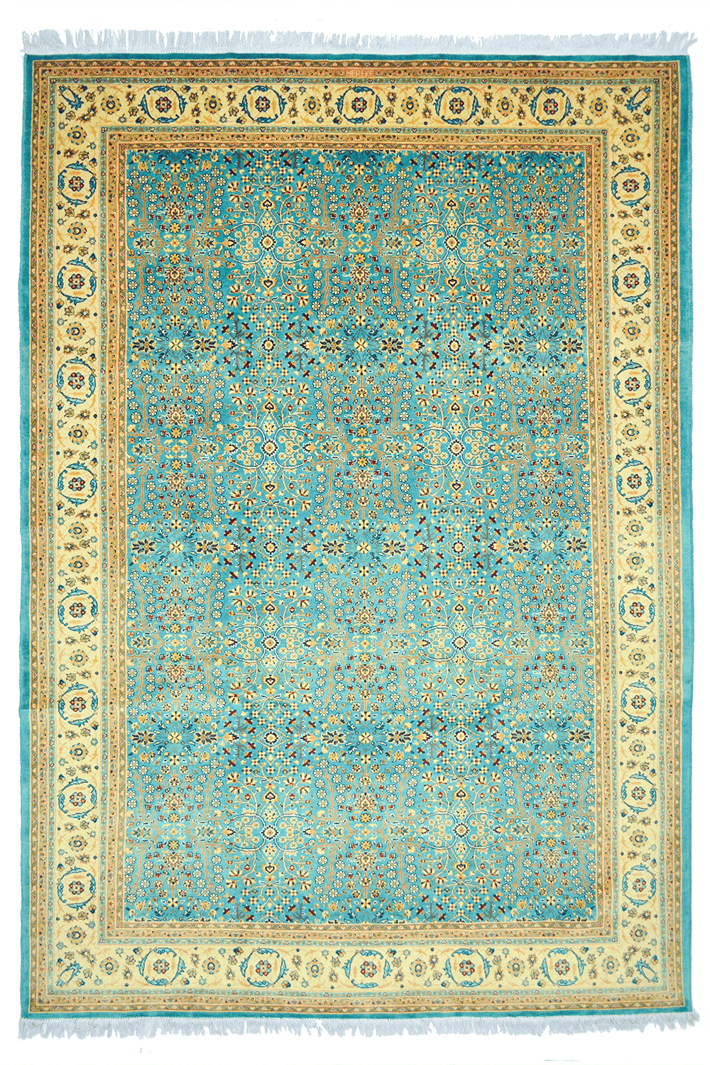 Klasik Hereke’nin simgesel desenlerinden Yedidağın Çiçeği motifi, bu halıda su yeşili renk tonlarıyla birleşerek zarif, yumuşak ve ferah bir görünüm sunar. 203x293 cm ölçüsü, geniş yaşam alanlarında dekoratif ve fonksiyonel kullanım sağlar.