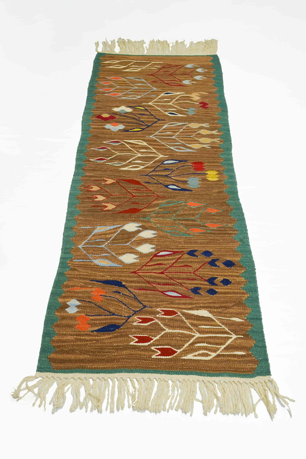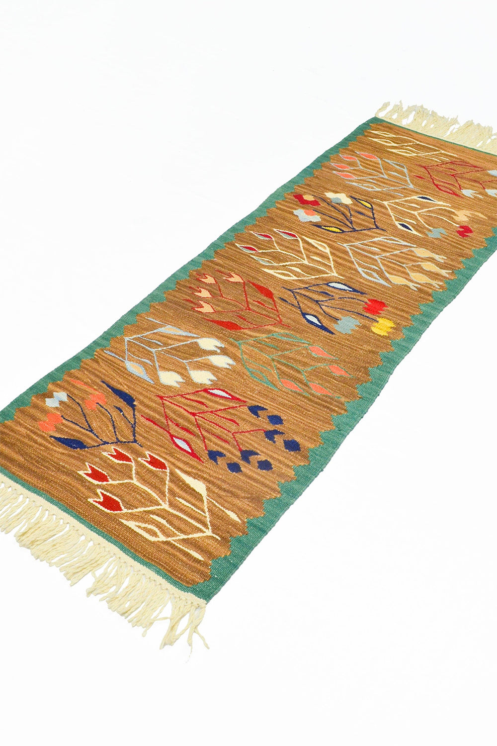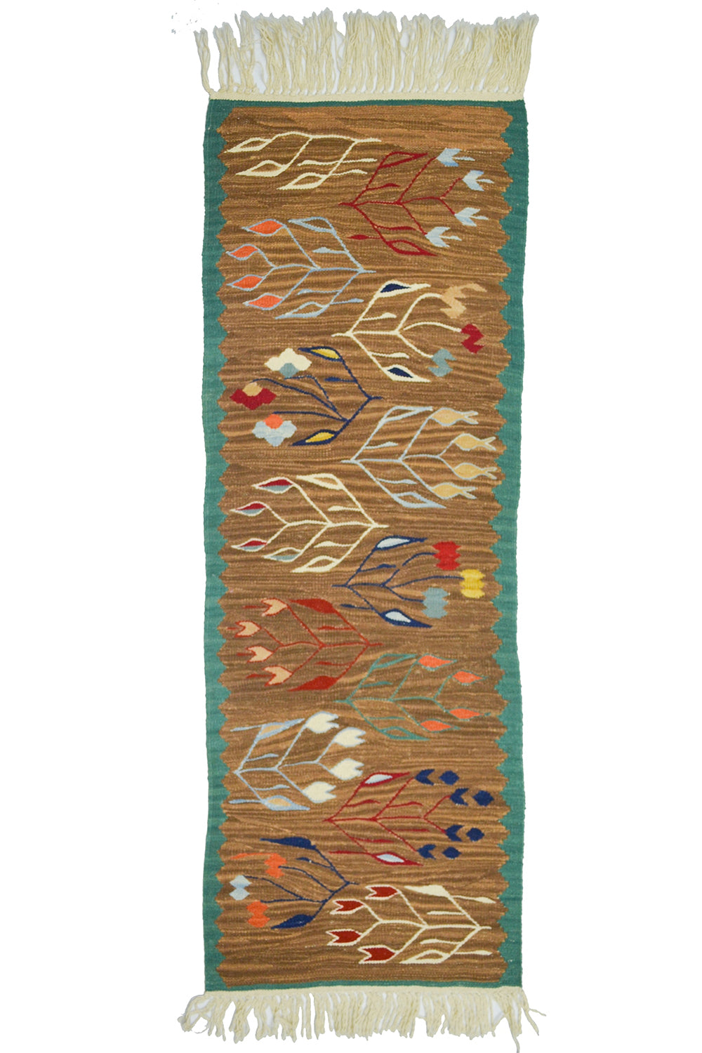 Doğal boyalarla elde edilen kahverengi ve yeşil tonlar, kilime canlı bir karakter kazandırır. Tezgâhta dokunan yapısı ve boyutsal nakış detayları sayesinde hem dekoratif hem de özgün bir parça olarak öne çıkar. 60x165 cm ölçüsüyle dar alanlar ve geçiş bölgeleri için uygundur.