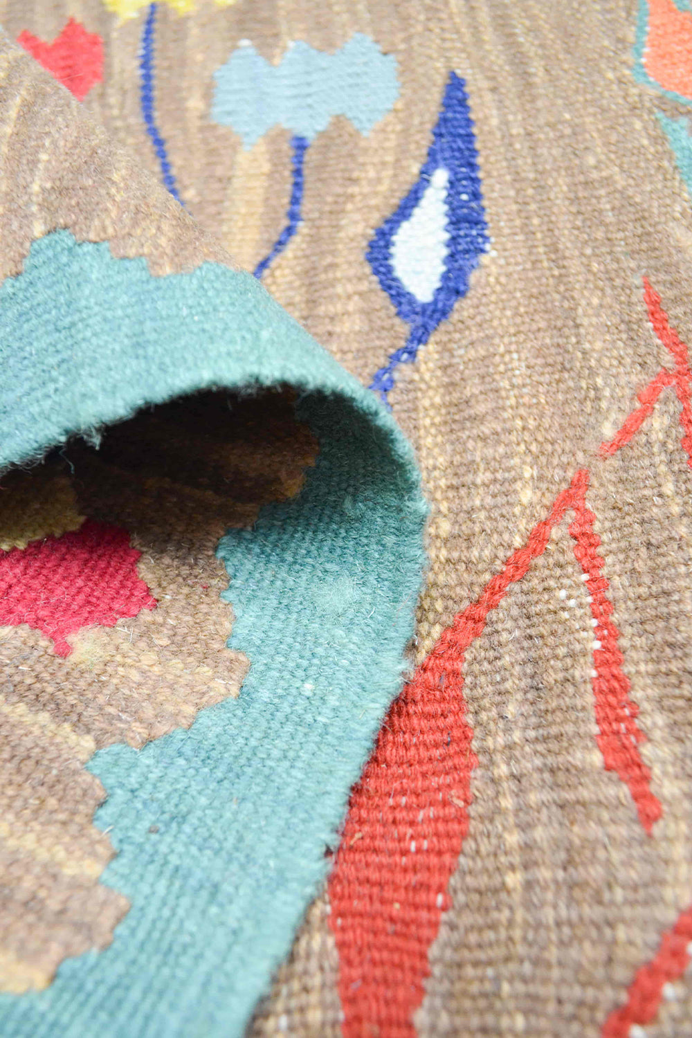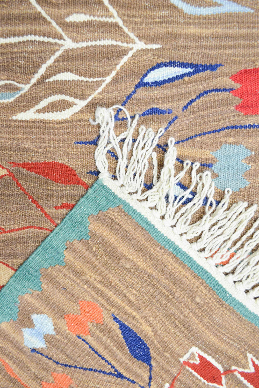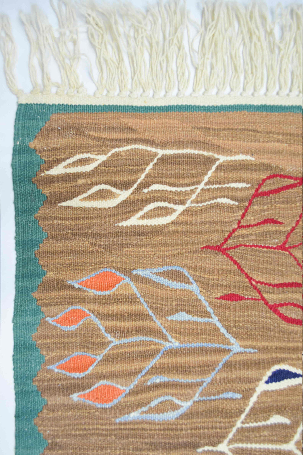 Doğal boyalarla elde edilen kahverengi ve yeşil tonlar, kilime canlı bir karakter kazandırır. Tezgâhta dokunan yapısı ve boyutsal nakış detayları sayesinde hem dekoratif hem de özgün bir parça olarak öne çıkar. 60x165 cm ölçüsüyle dar alanlar ve geçiş bölgeleri için uygundur.