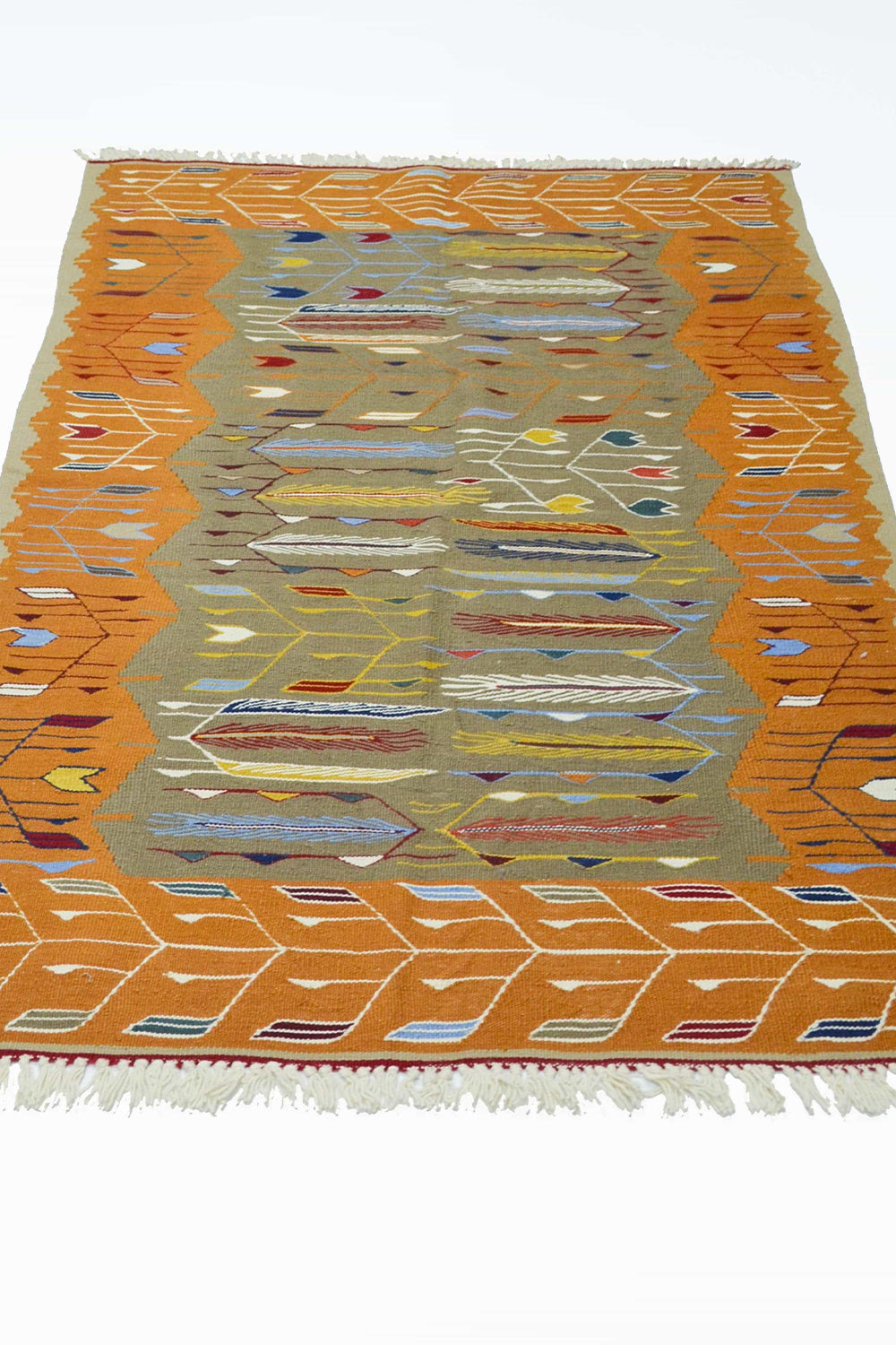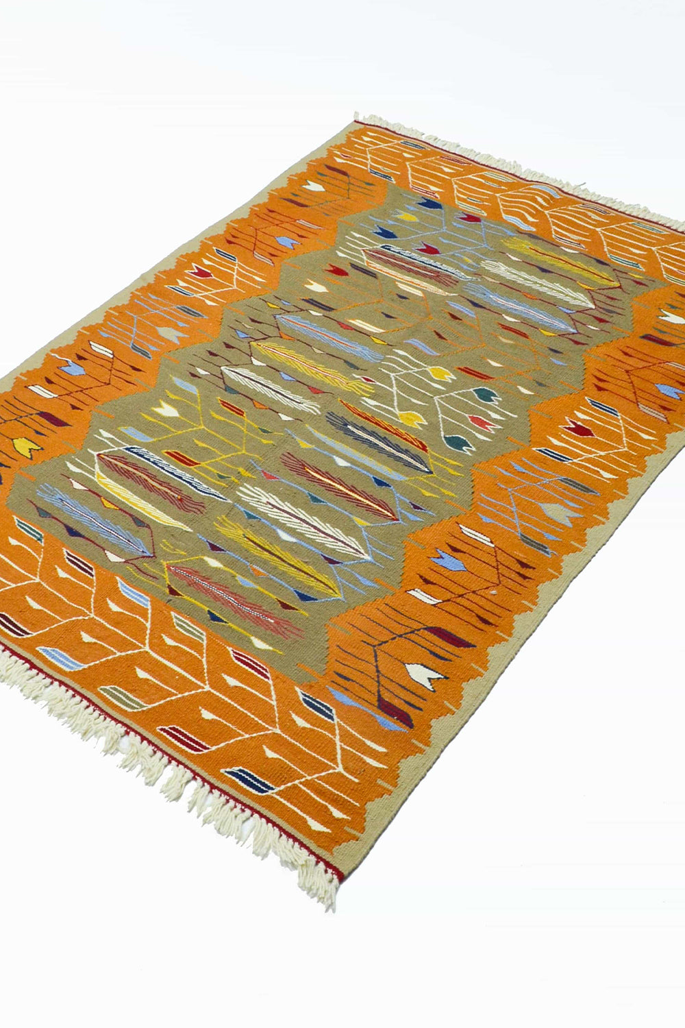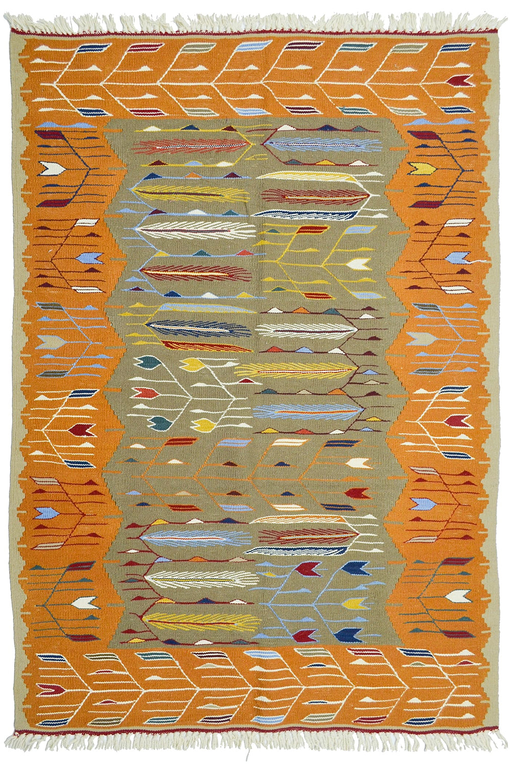 Bu el dokuma Uşak kilimi, Batı Anadolu’da geleneksel yöntemlerle yün iplikler kullanılarak dokunmuştur. Üzerinde birlikte yer alan lale ve buğday başağı motifleri, zarafet, bereket ve bolluğu simgeler. Taba ve vizon tonlarının uyumu, kilime doğal, sade ve zamansız bir görünüm kazandırır. 110x170 cm ölçüsüyle salon, oturma alanı ve geniş geçiş alanlarında dekoratif ve işlevsel bir kullanım sunar.