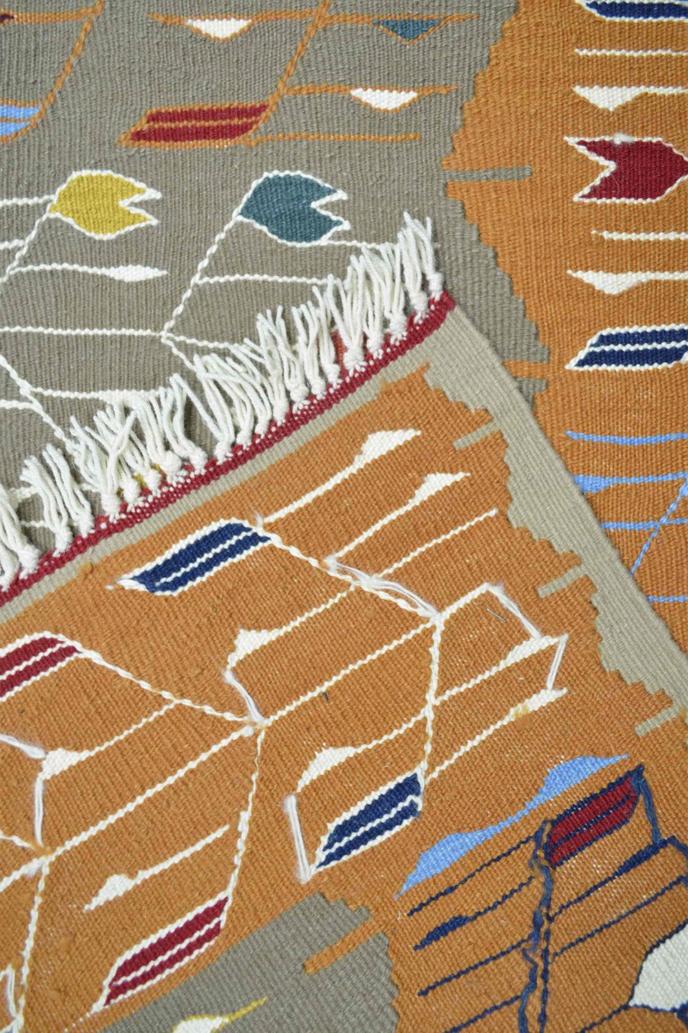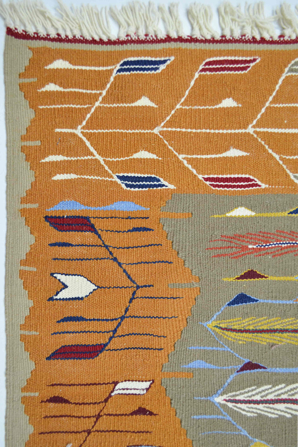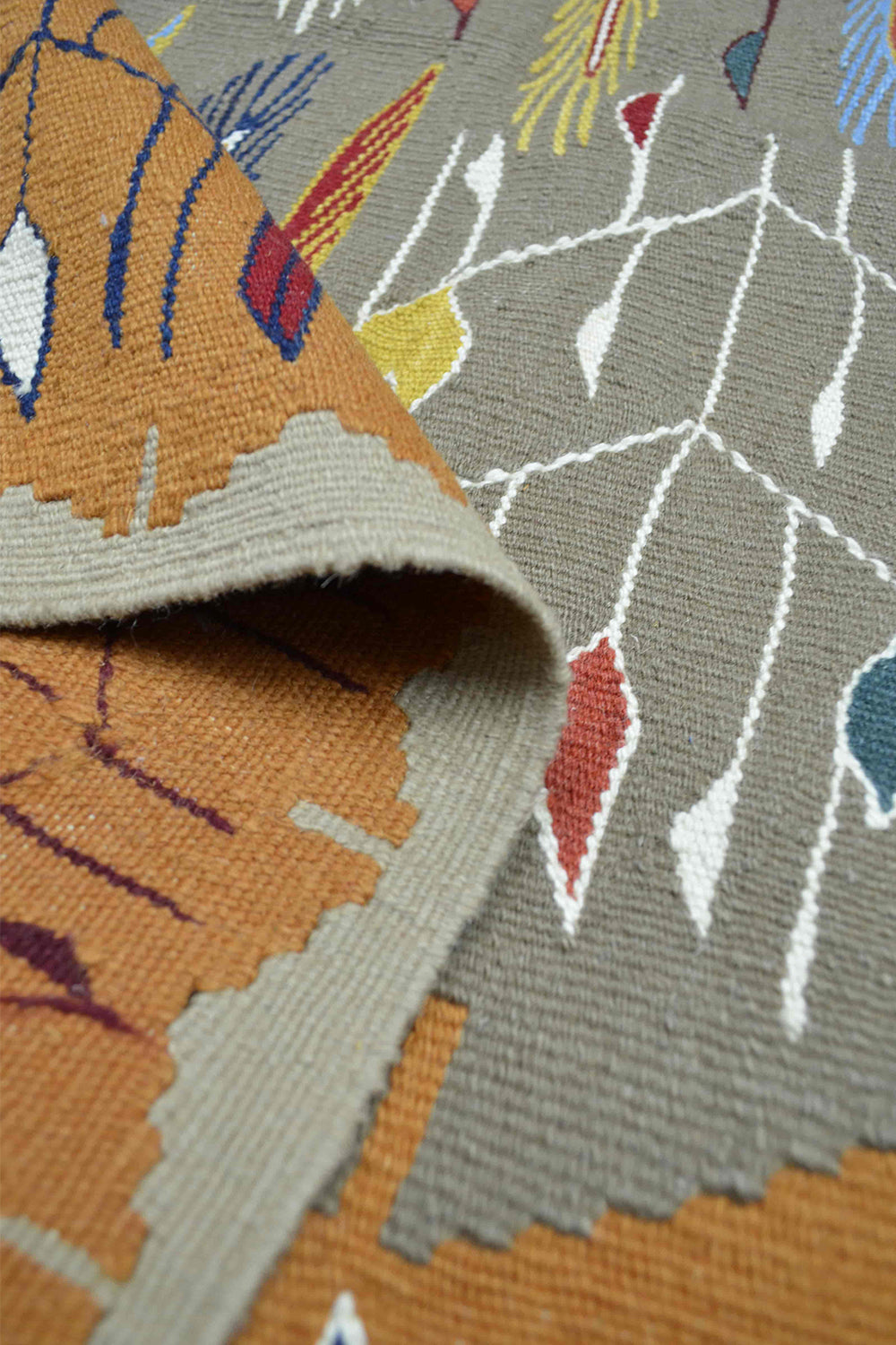 Bu el dokuma Uşak kilimi, Batı Anadolu’da geleneksel yöntemlerle yün iplikler kullanılarak dokunmuştur. Üzerinde birlikte yer alan lale ve buğday başağı motifleri, zarafet, bereket ve bolluğu simgeler. Taba ve vizon tonlarının uyumu, kilime doğal, sade ve zamansız bir görünüm kazandırır. 110x170 cm ölçüsüyle salon, oturma alanı ve geniş geçiş alanlarında dekoratif ve işlevsel bir kullanım sunar.