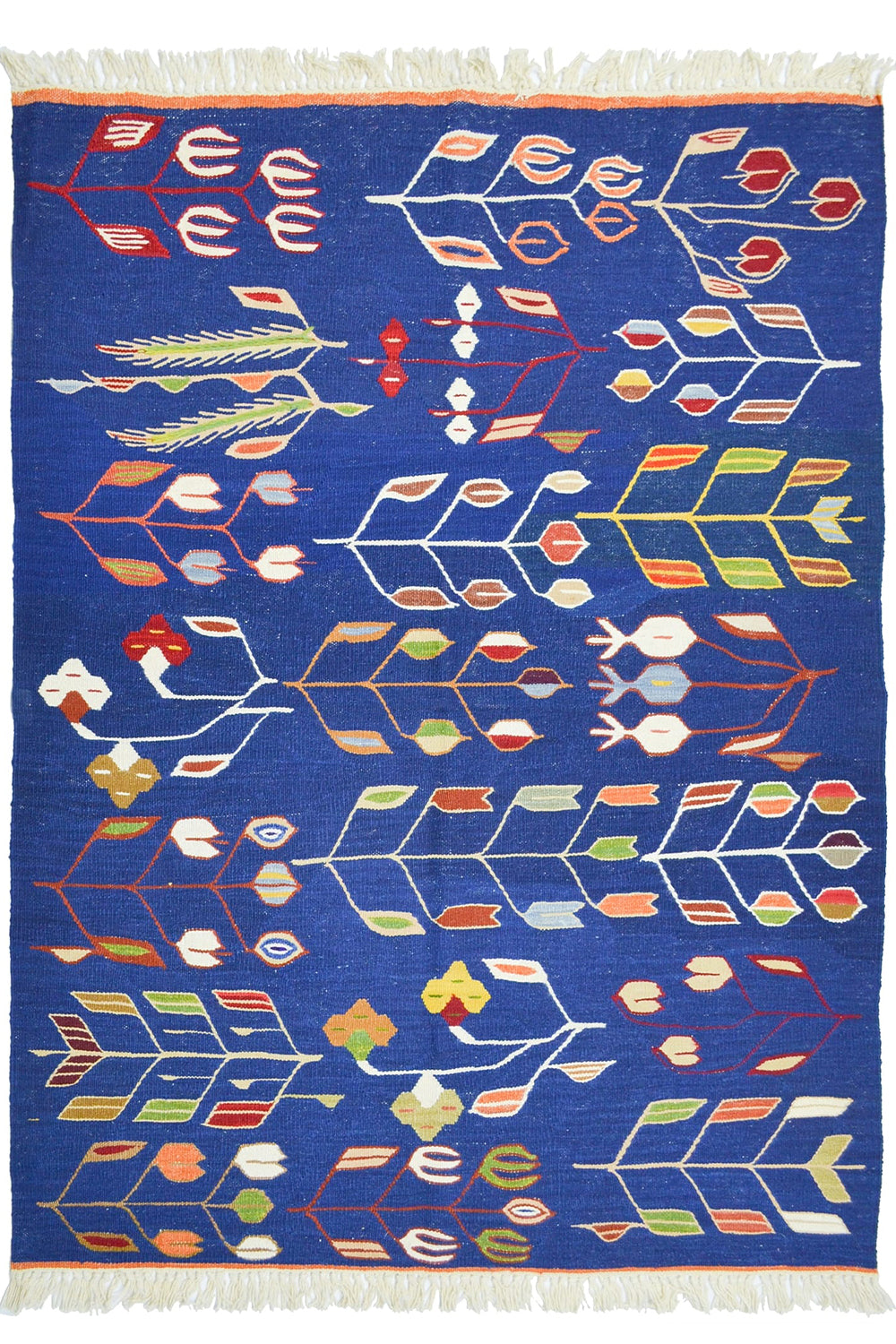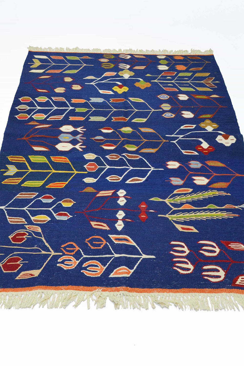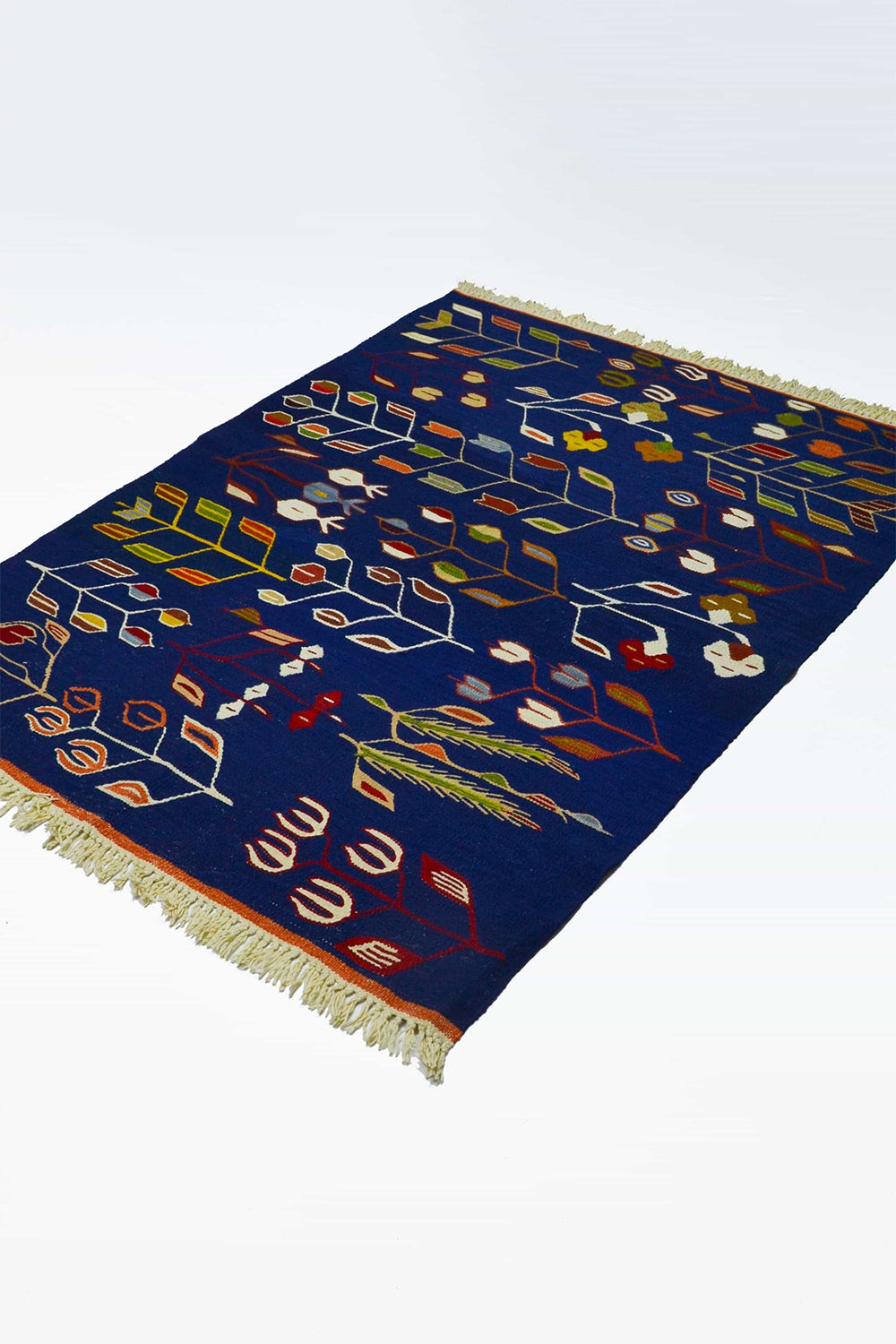 Bu el dokuma Uşak kilimi, Batı Anadolu’da geleneksel yöntemlerle %100 yün iplik kullanılarak dokunmuştur. Üzerinde birlikte yer alan lale ve buğday başağı motifleri, zarafet, bereket ve bolluğu simgeler. Lacivert rengin derin ve güçlü duruşu, kilime klasik ve zamansız bir karakter kazandırır. 122x172 cm ölçüsüyle salon, oturma alanı ve geçiş alanlarında rahatlıkla kullanılabilir.
