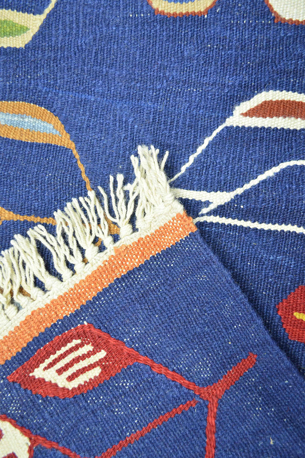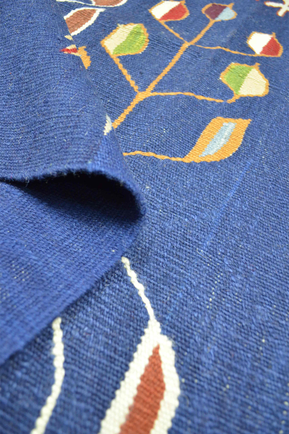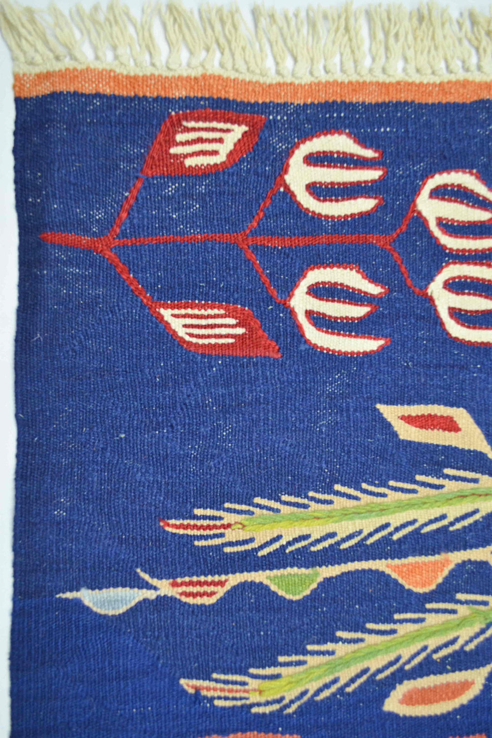 Bu el dokuma Uşak kilimi, Batı Anadolu’da geleneksel yöntemlerle %100 yün iplik kullanılarak dokunmuştur. Üzerinde birlikte yer alan lale ve buğday başağı motifleri, zarafet, bereket ve bolluğu simgeler. Lacivert rengin derin ve güçlü duruşu, kilime klasik ve zamansız bir karakter kazandırır. 122x172 cm ölçüsüyle salon, oturma alanı ve geçiş alanlarında rahatlıkla kullanılabilir.