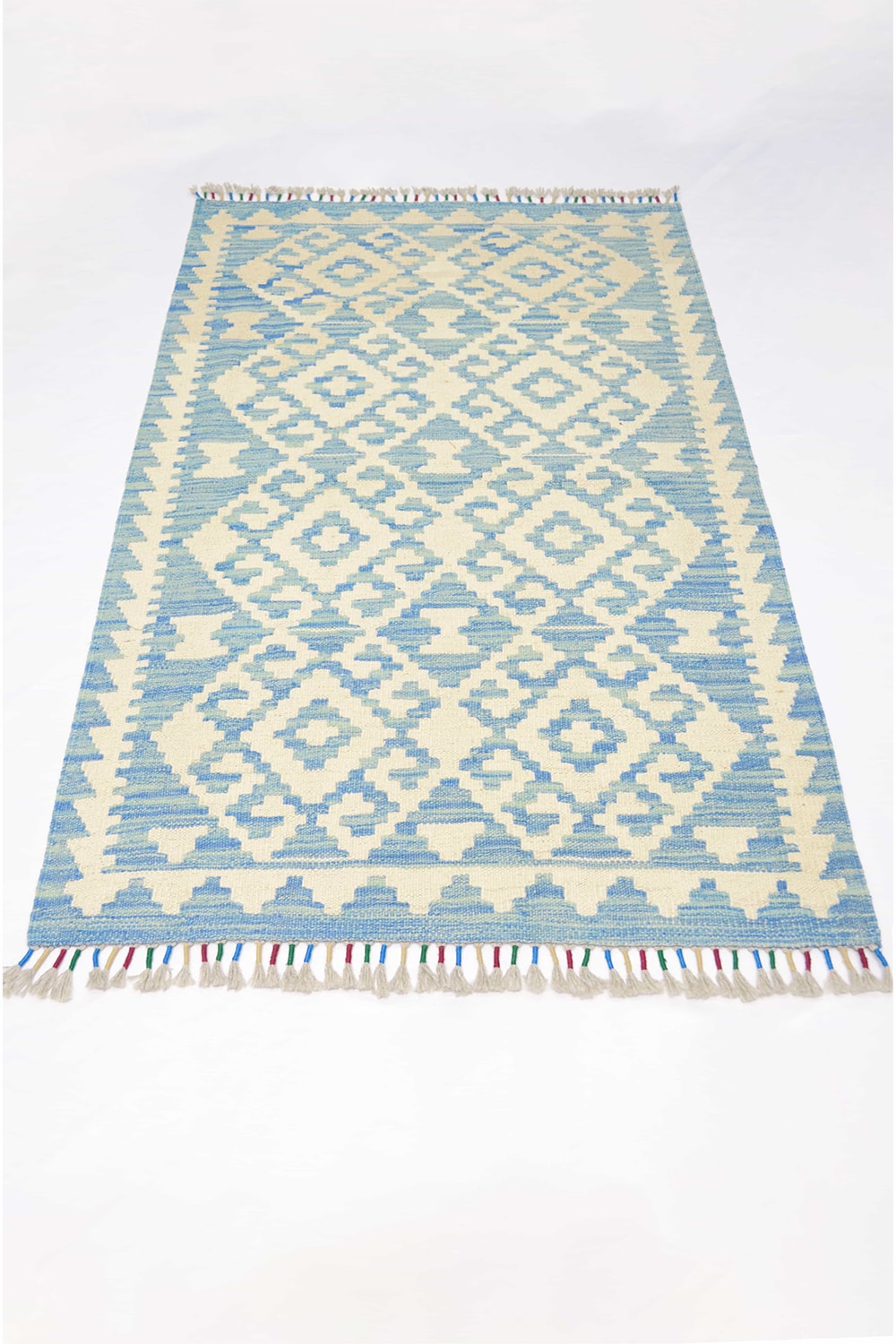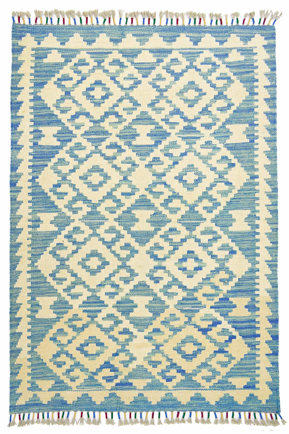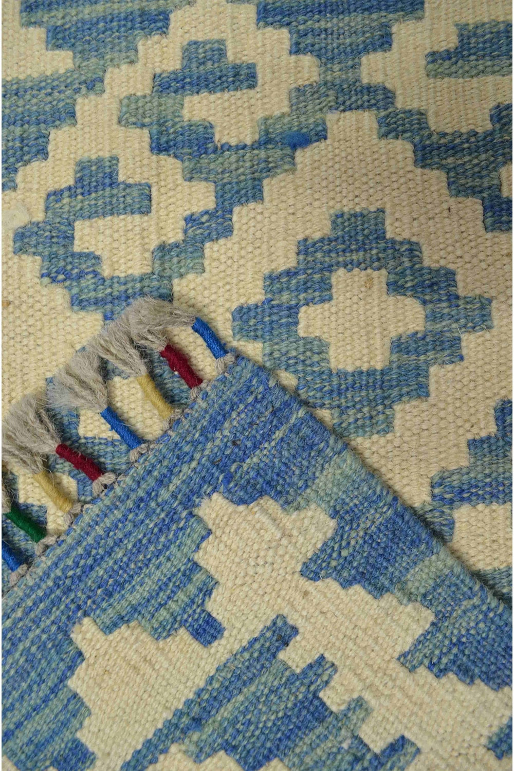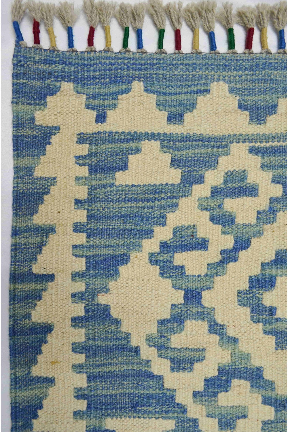 Yün İplikten El Dokuma Krem Ve Mavi Renk Afgan Kilim 83x127 Cm