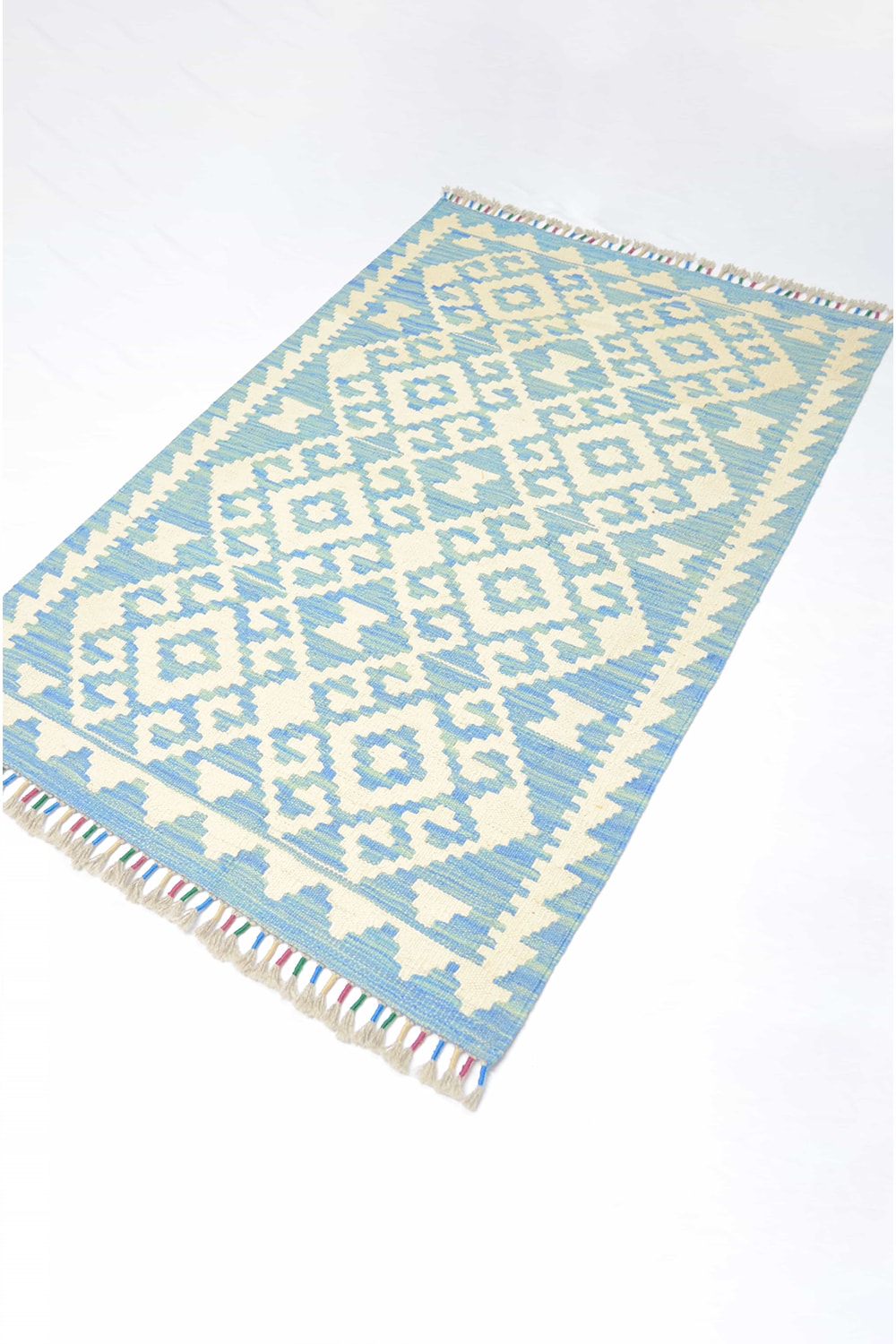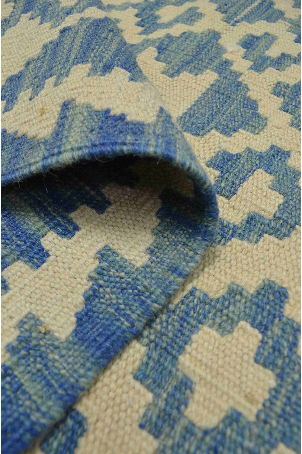 Afgan Kilimi, yün saçak üzerine yün iplikten, geleneksel el dokuma tekniğiyle hazırlanmış özel bir kilimdir. Krem ve mavi tonlarının uyumu, geometrik desenlerle birleşerek otantik bir görünüm sunar ve farklı dekorasyonlara zarif bir dokunuş katar.