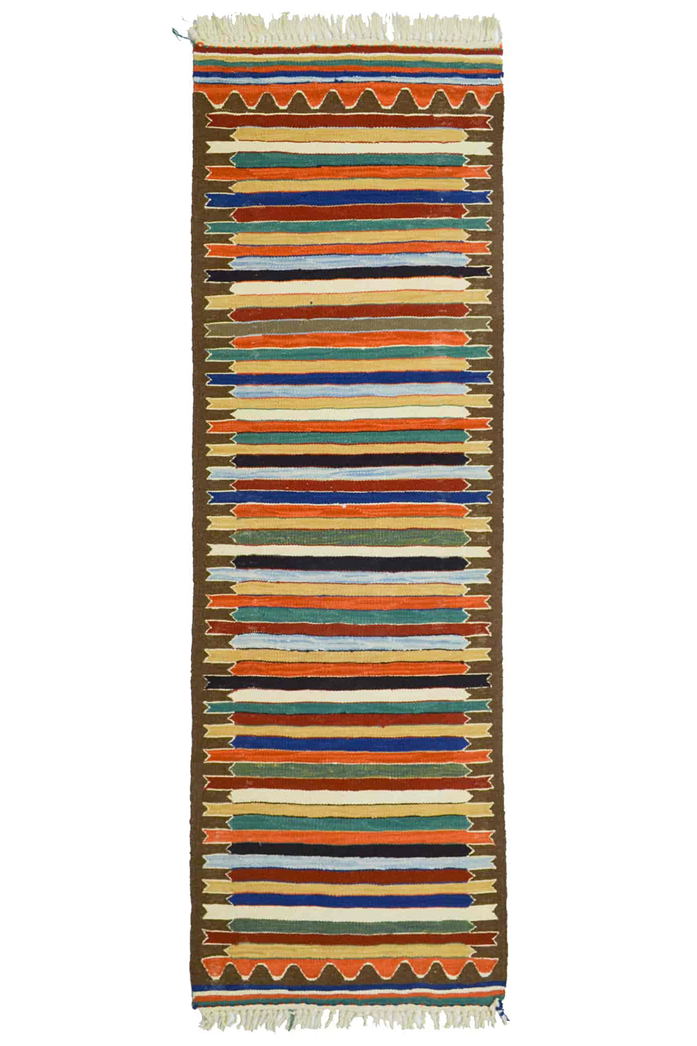 Bu el dokuma Uşak kilimi, tamamen yün ipliklerle üretilmiş olup kahverengi çerçevesi ve ortasında yer alan rengârenk çizgili dokusuyla dikkat çeker. Geleneksel Uşak kilimlerinde sıkça görülen sade çerçeve - hareketli merkez dengesi, kilime hem karakter hem de canlılık kazandırır. 58x173 cm ölçüsü sayesinde dar alanlar, koridorlar ve geçiş bölgelerinde dekoratif ve işlevsel bir kullanım sunar.