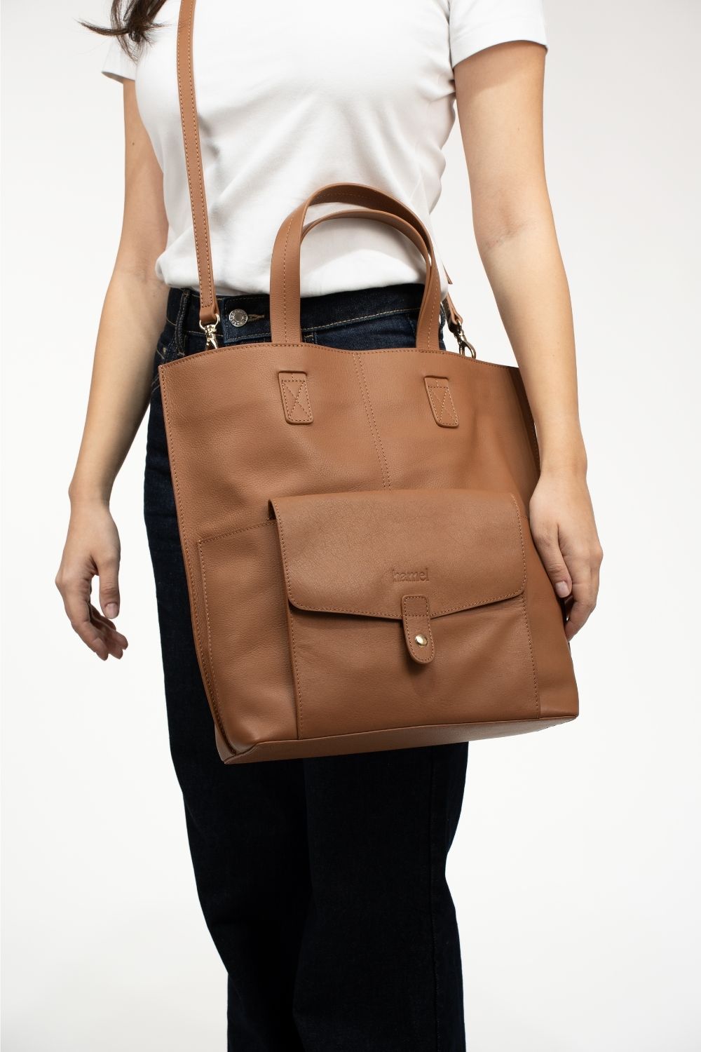 Dayanıklı ve şık bir görünüm için %100 hakiki dana derisinden üretilen taba rengi lüks Goya çanta ile tanışın. Bu geniş çanta, fermuarlarla uğraşmadan eşyalarınıza kolay erişim sağlayan manyetik ön cebe sahiptir. Ayarlanabilir askıları çıkarılarak elde taşınabilir hale getirilebilir, bu da her duruma uygun çok yönlülük sağlar. İster günlük işlerinizi hallediyor olun ister gece dışarı çıkıyor olun, Goya Çanta her kıyafet için mükemmel bir aksesuardır.