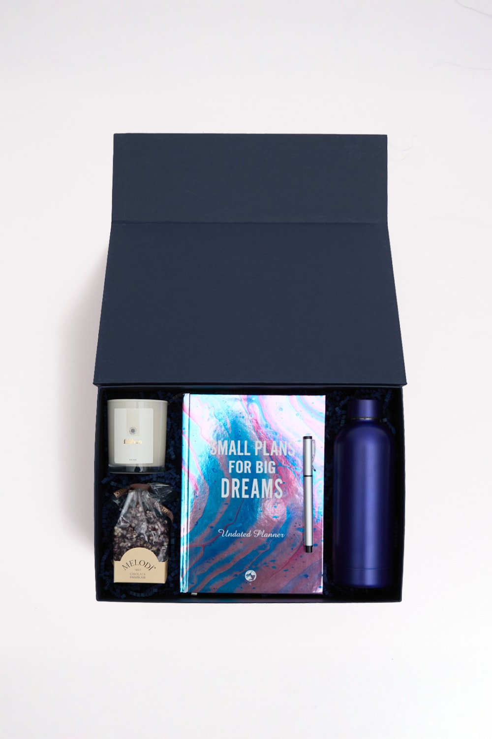 Zarif detaylarla tasarlanan Wish hediye kutusu, yeni başlangıçlara ilham vermek ve umut dolu bir yolculuğa adım atmak isteyenler için hazırlandı. Sürdürülebilir malzemelerden üretilen termos, doğa dostu bir yaşam tarzını desteklerken; süresiz planlayıcı, hayalleri ve hedefleri yazıya dökerek bir adım daha ileri gitmeyi hatırlatır. şık detaylar ve küçük mutluluklar, bu kutuyu yeni yollara çıkanlara, sevdiklerine anlamlı bir hediye vermek isteyenlere ya da sadece bir mola verip kendini şımartmak isteyenlere özel bir seçim haline getiriyor.