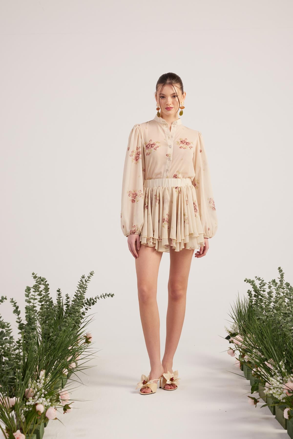 Çiçekli Gömlek Ve Şort Etekli Valeria Takım Bej
