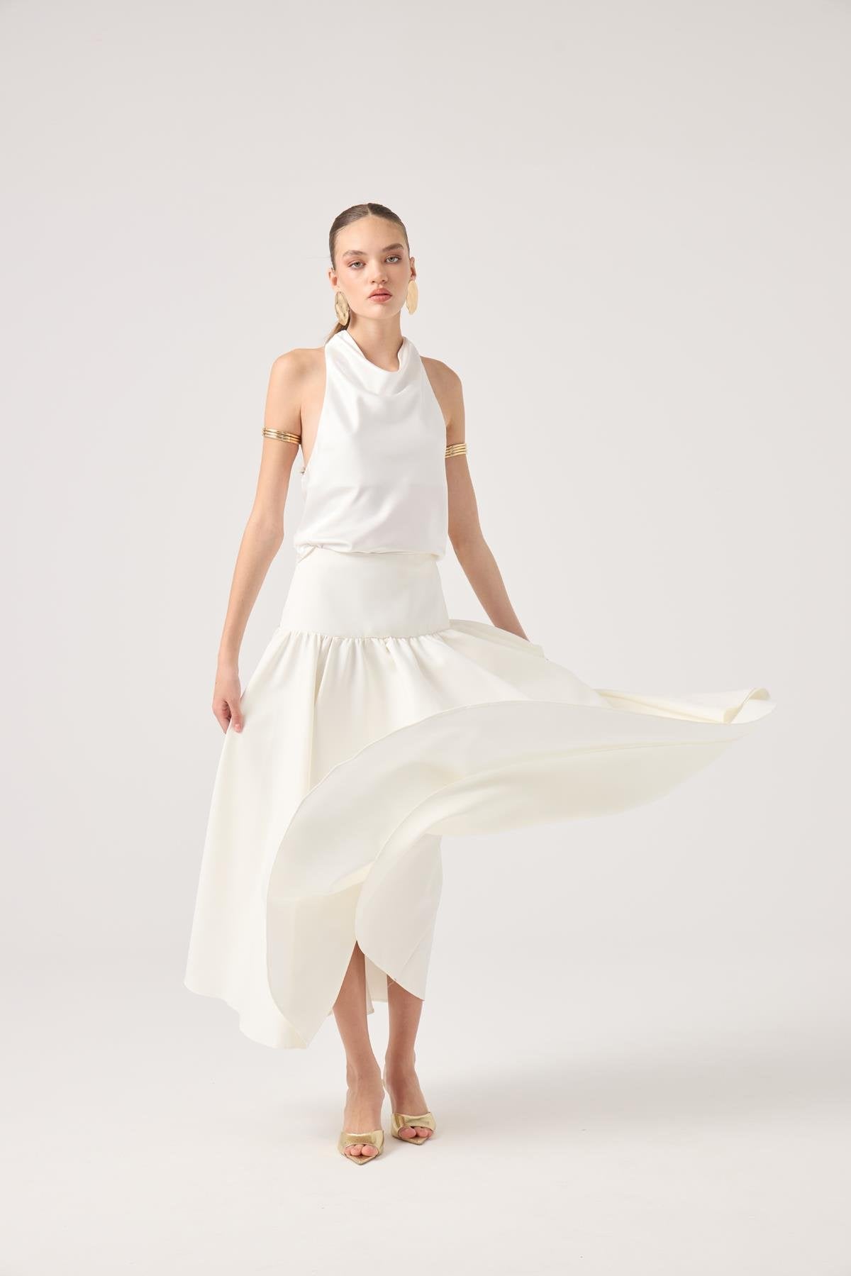 Özellikler: Boyundan bağlamalı, sırtı açık, degaje yaka, saten kumaş