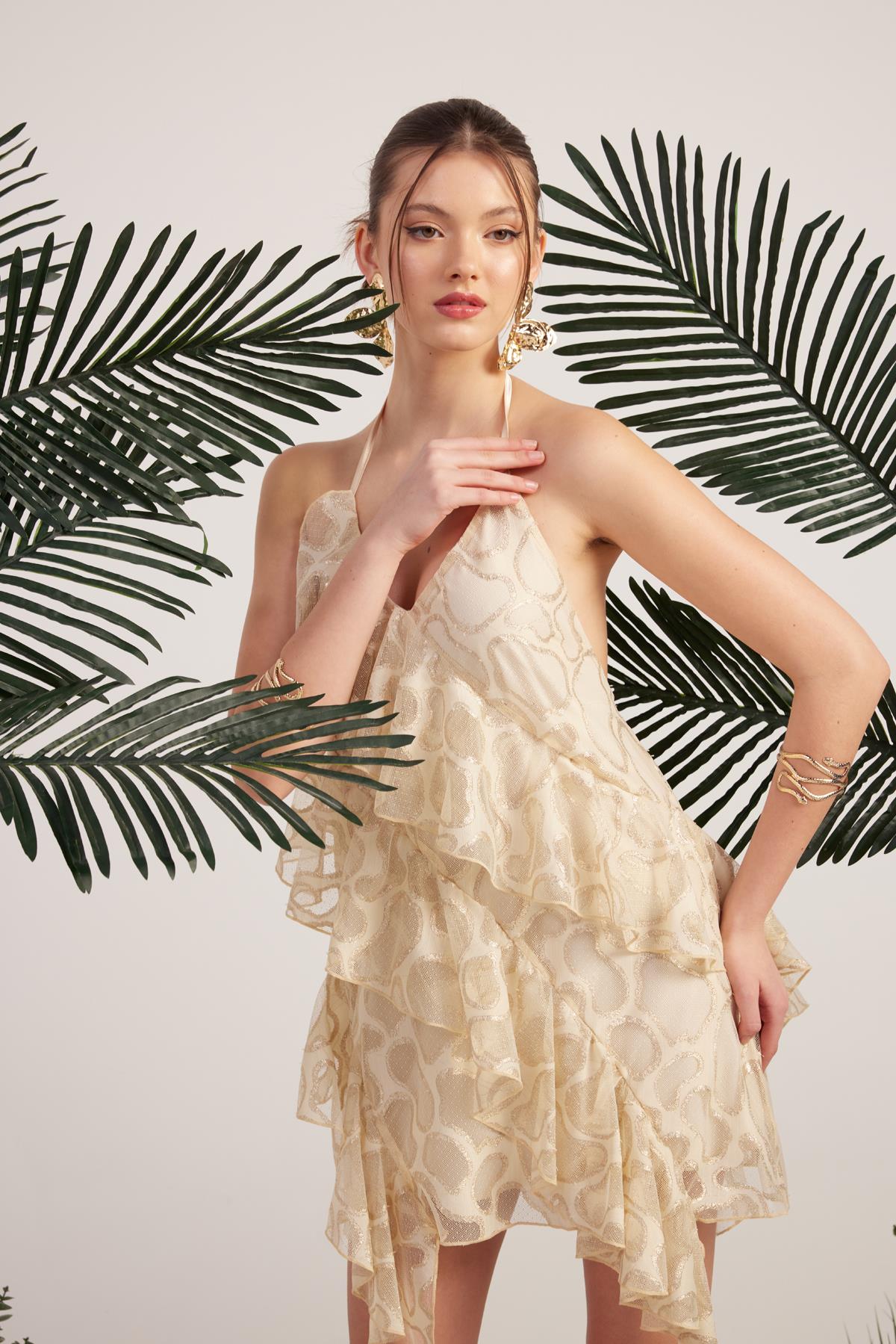 Fırfırlı Parlak Kumaşlı Mini Daniela Elbise Bej