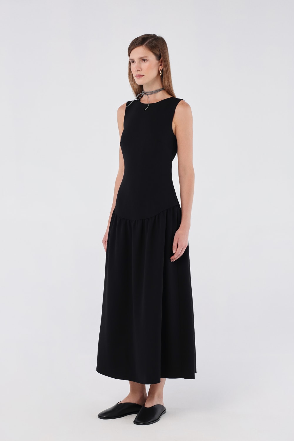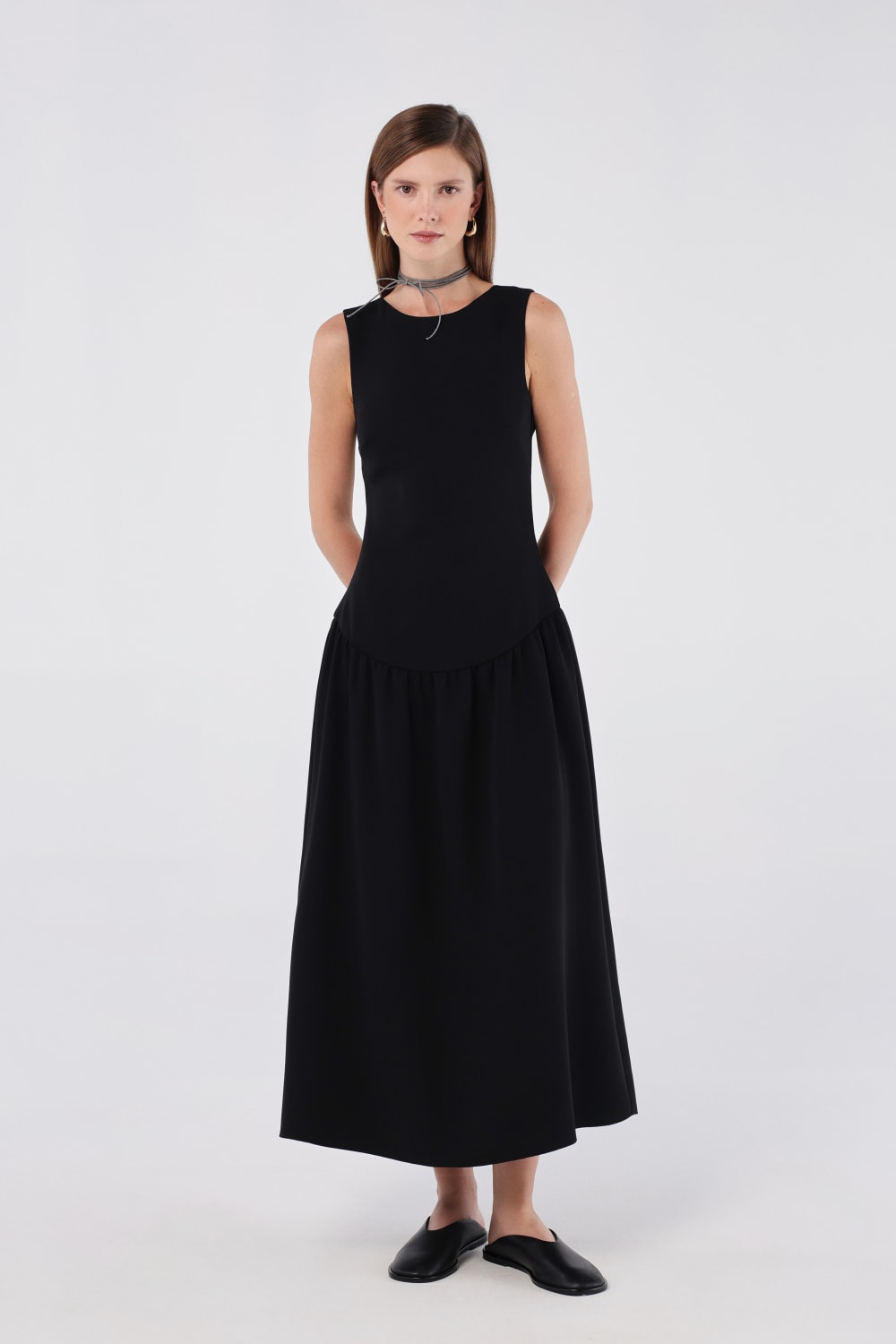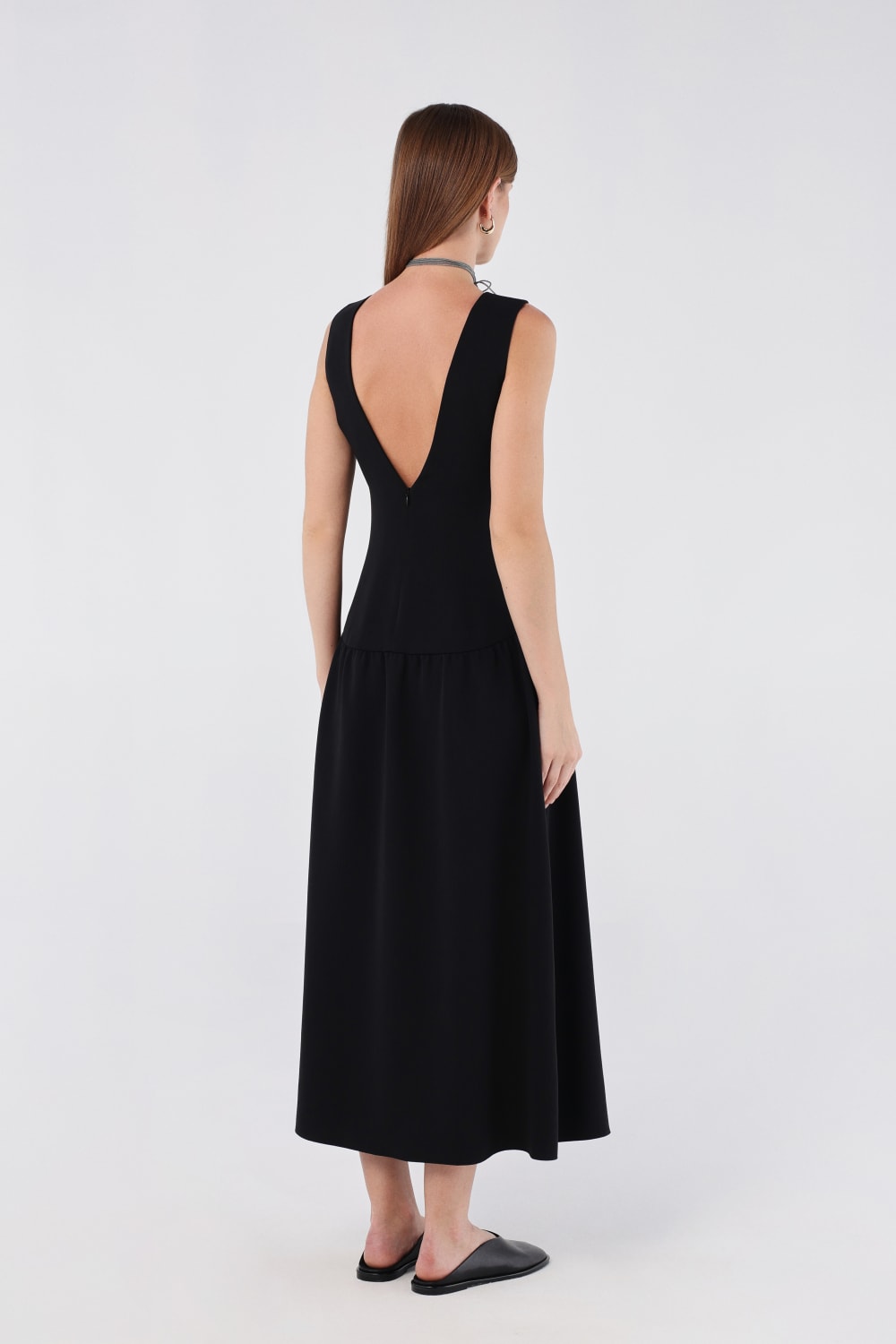 Zarif kayık yaka tasarımı ve derin V kesimli sırt detayıyla sofistike bir görünüm sunar. Vücuda oturan üst kısmı, akıcı midi boy eteğe geçerek zarif ve modern bir siluet oluşturur. Gizli arka fermuar ile kusursuz bir uyum sağlar. Hem resmi hem de günlük kullanıma uygun, zamansız bir parça.