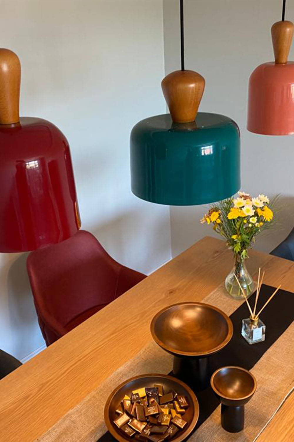 Atolye'nin Rainbow serisi 3 farklı boyda ve onlarca farklı renkte üretilen metal ile ahşap materyalin buluştuğu tekli sarkıtlar serisidir.