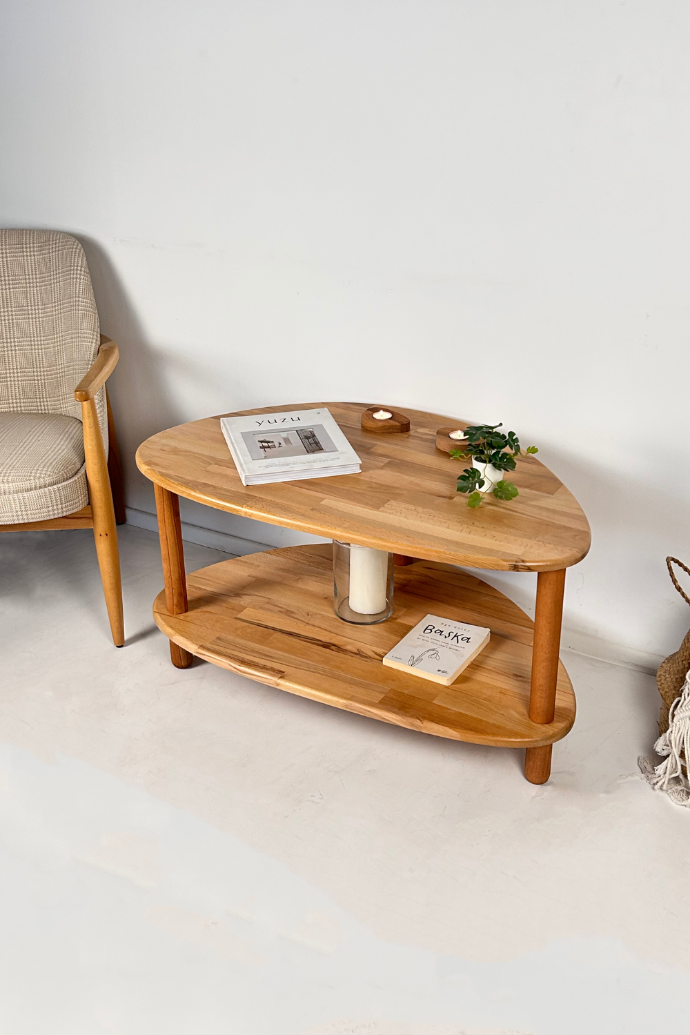 Yaşam alanlarınıza sıcaklık ve şıklık katacak bu doğal ahşapiki raflı orta sehpa, zarif tasarımıyla dikkat çekiyor. Organik formdaki üsttabla ve alt raf, hem estetik hem de işlevsel bir kullanım sunar.Kitaplarınızı, dekoratif objelerinizi rahatça yerleştirebileceğiniz geniş yüzeyi ile salonlarınıza ferahlık kazandırır.