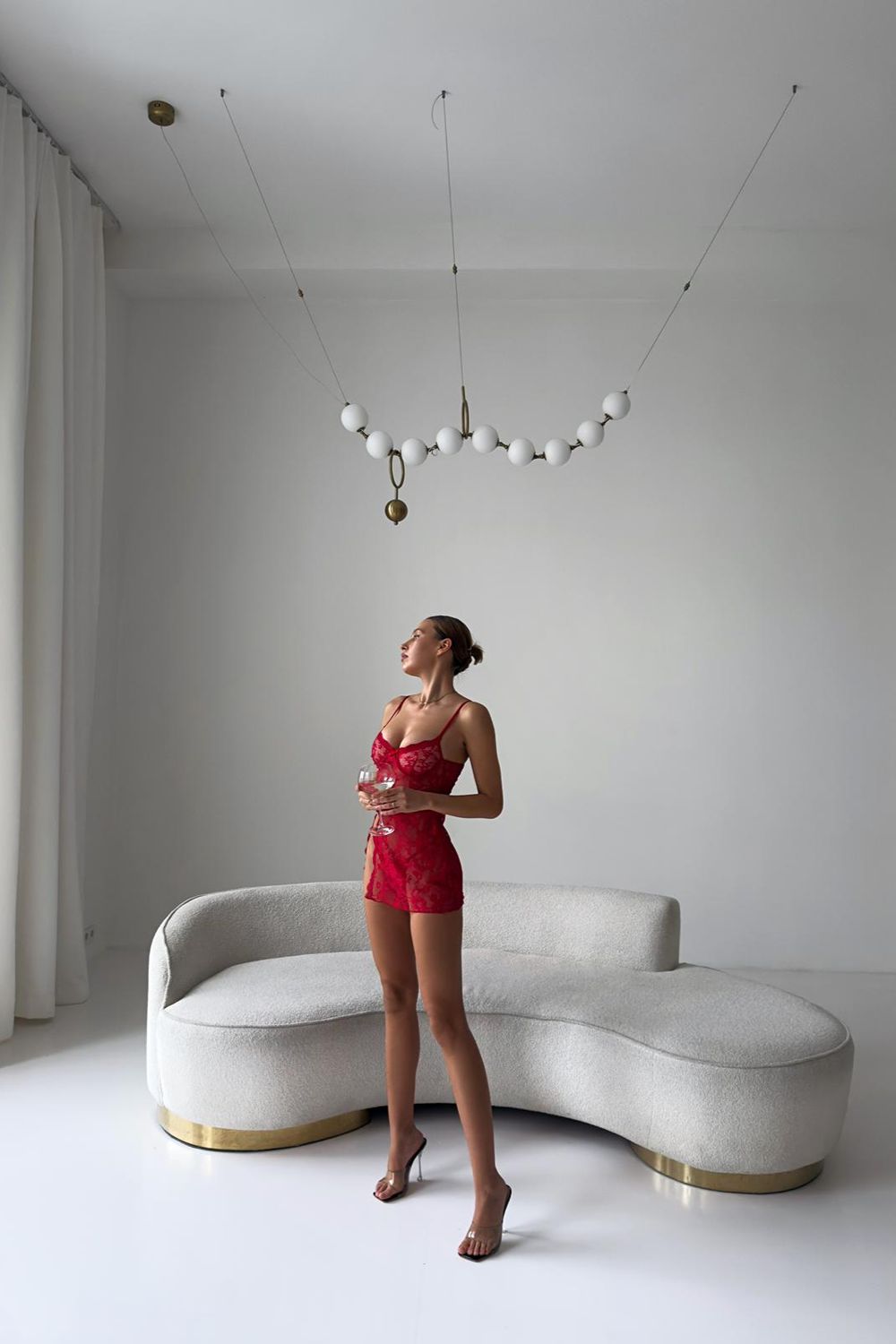 Saphira Babydoll Set, ince zarif dantelin transparan dokusuyla yeniden yorumlanan ikonik bir siluet sunar. Göğüs kısmındaki destekleyici yapı bedeni nazikçe kavrarken, belde yer alan taş detaylı bantlar tasarıma sofistike bir ışıltı katar. Yan ve ön yırtmaçların akıcı formu, görünümü hem feminen hem de modern bir çekiciliğe taşır.
