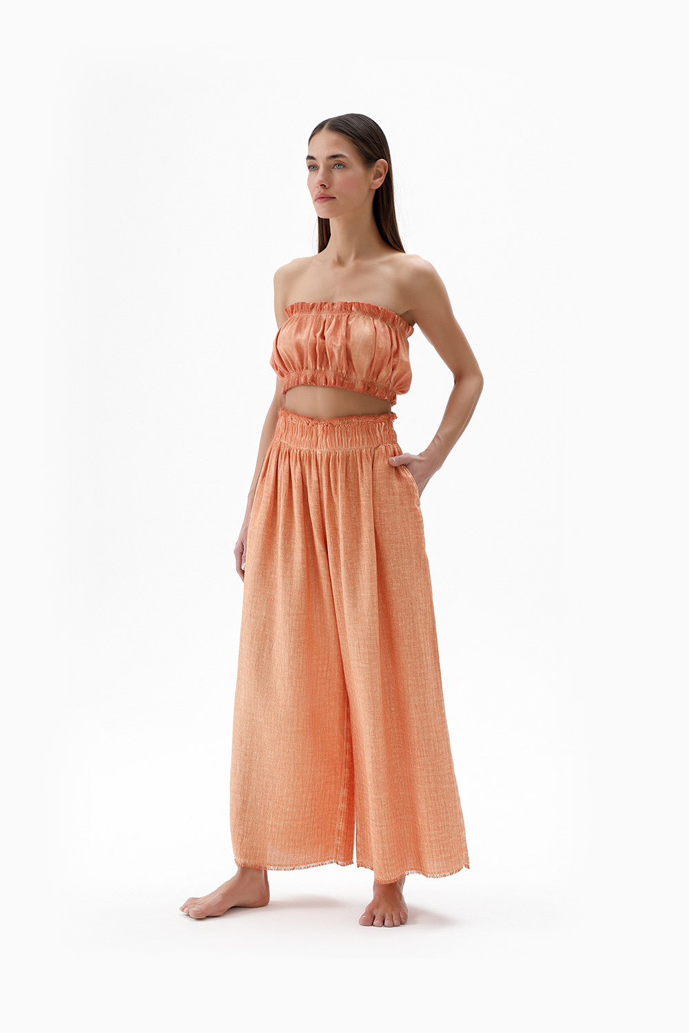 Doğal keten ve pamuk lifleriyle harmanlanarak yavaş yavaş dokunan bu rahat kesim pantolon, her bedene uyum sağlayan bir yapıya sahiptir.