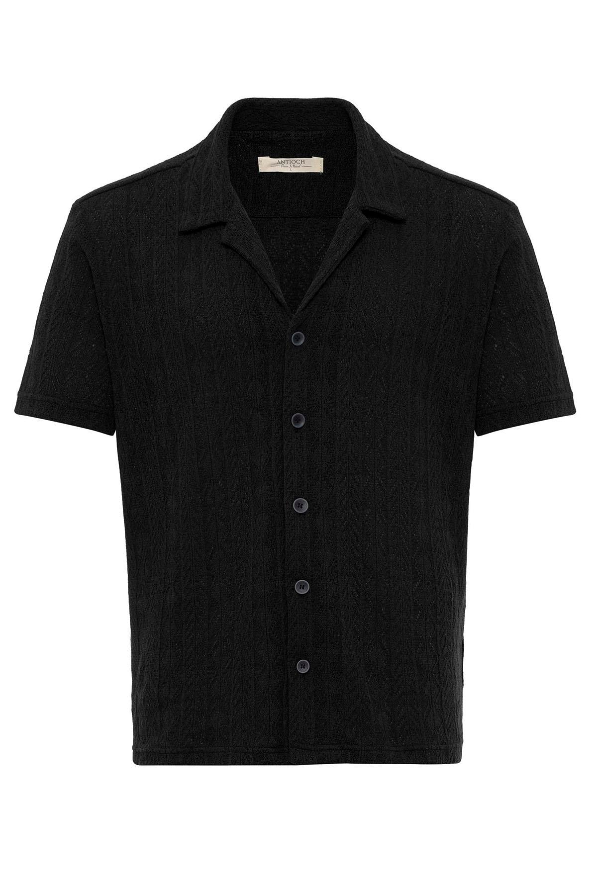 Siyah Apaş Yaka Örme Desenli Erkek Gömlek