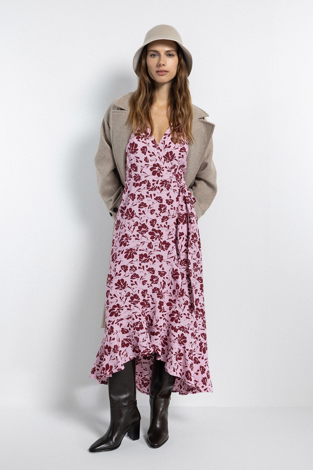 Bu fırfırlı şal uzun elbise, lüks ağır LYOCELL-TENCEL kumaştan hazırlanmış bir zarafet ve stil şaheseridir.