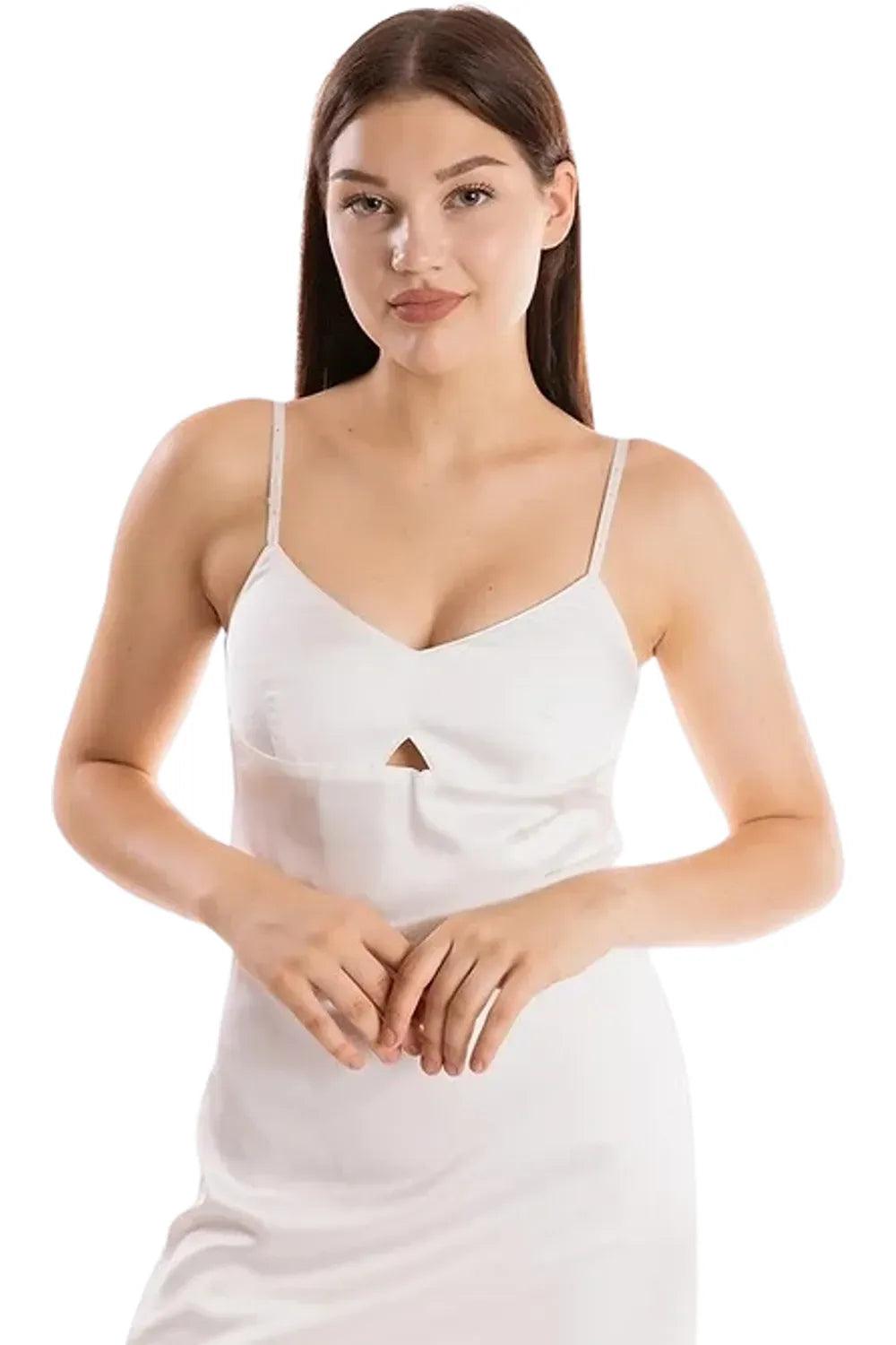 Etekucu kürklü askısı ayarlanabilir saten , önde pencere detaylı arkası fermuarlı mini elbise