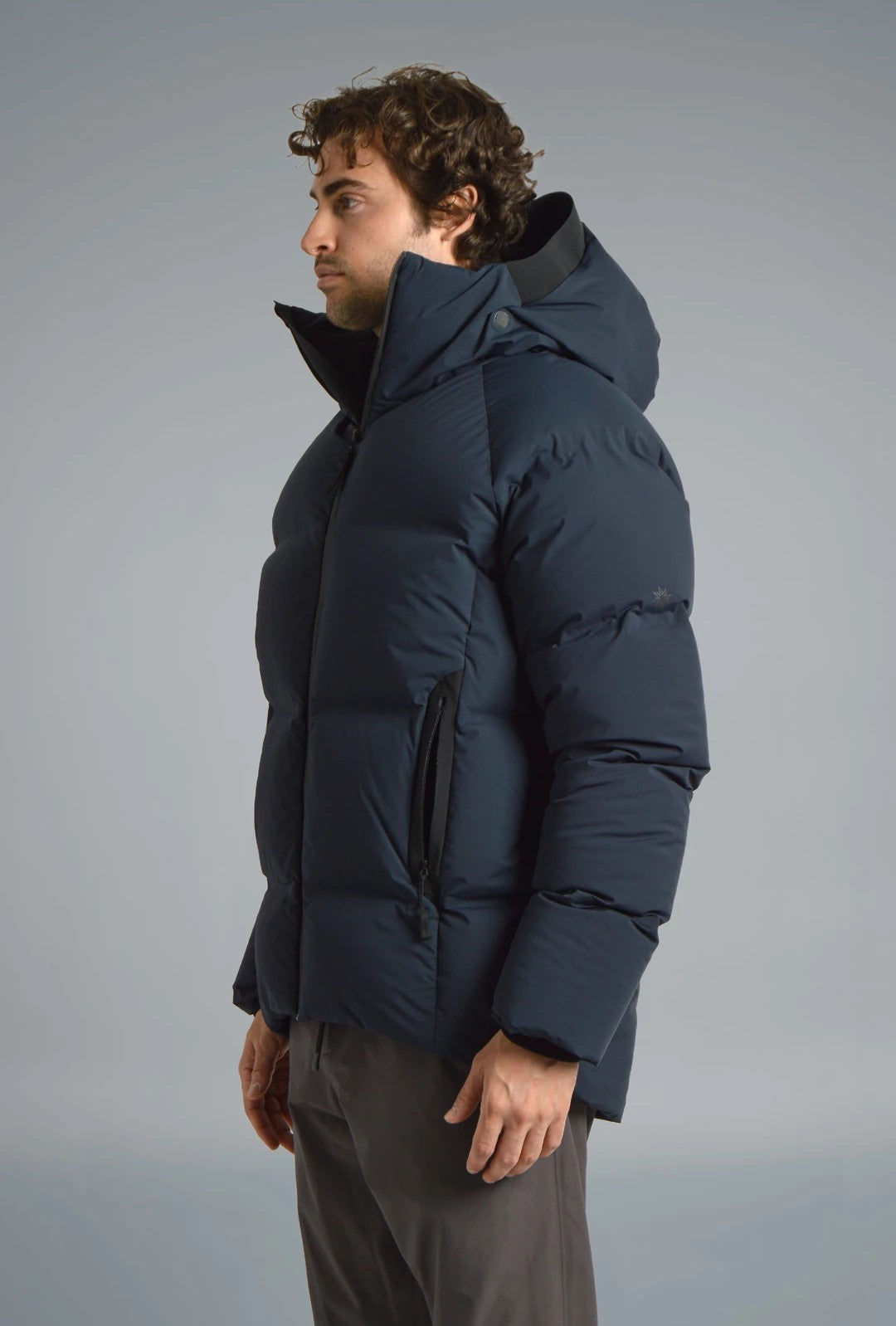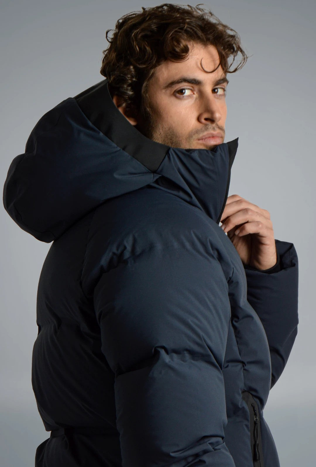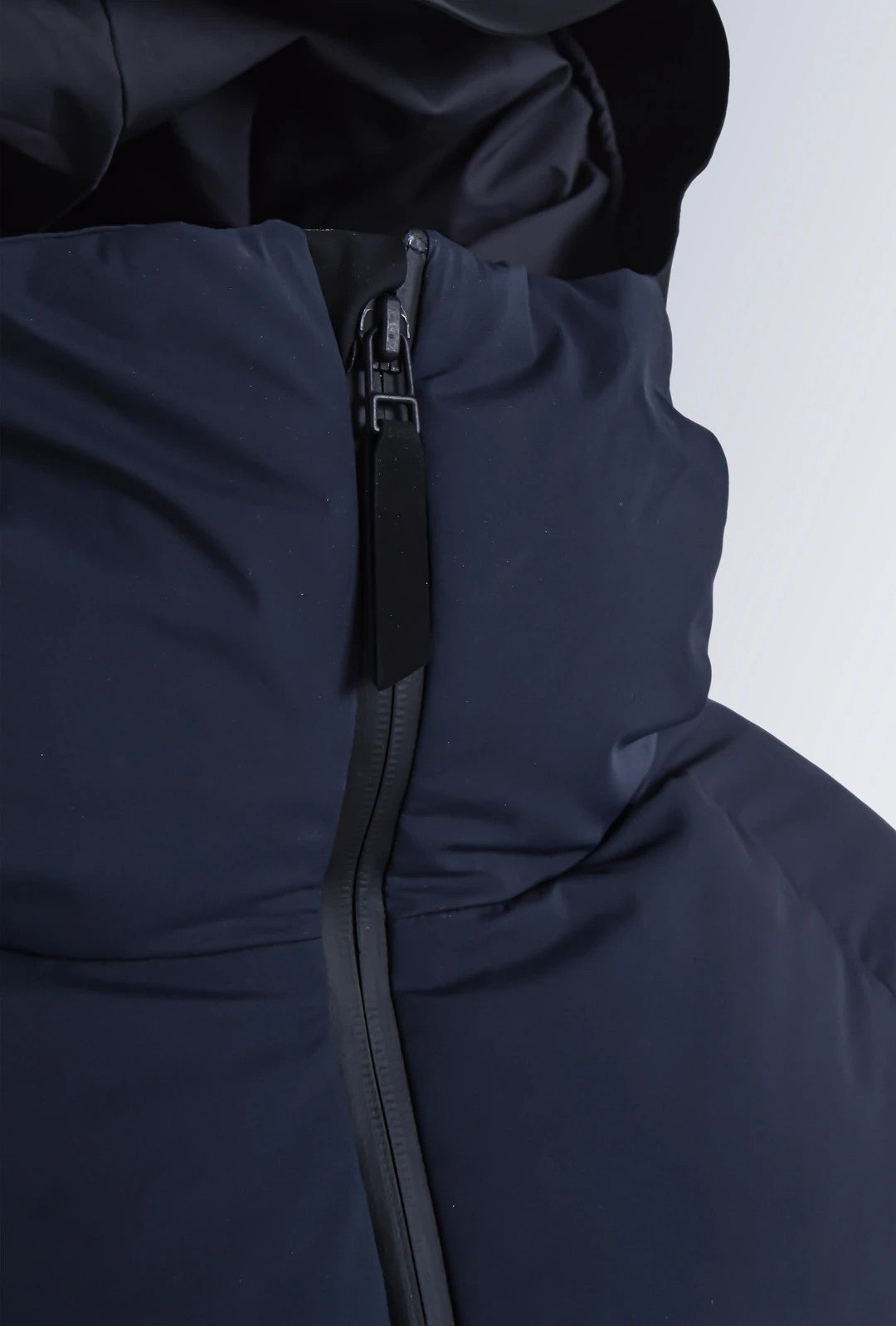 Beyaz kaz tüyü dolum ile başı saran kapüşon, patentli bir koahhaesive kordon kullanım sistemine sahip kaynaklı ergonomik bir sipere sahiptir ve tüm fermuarlar YKK aquaguard'dır .