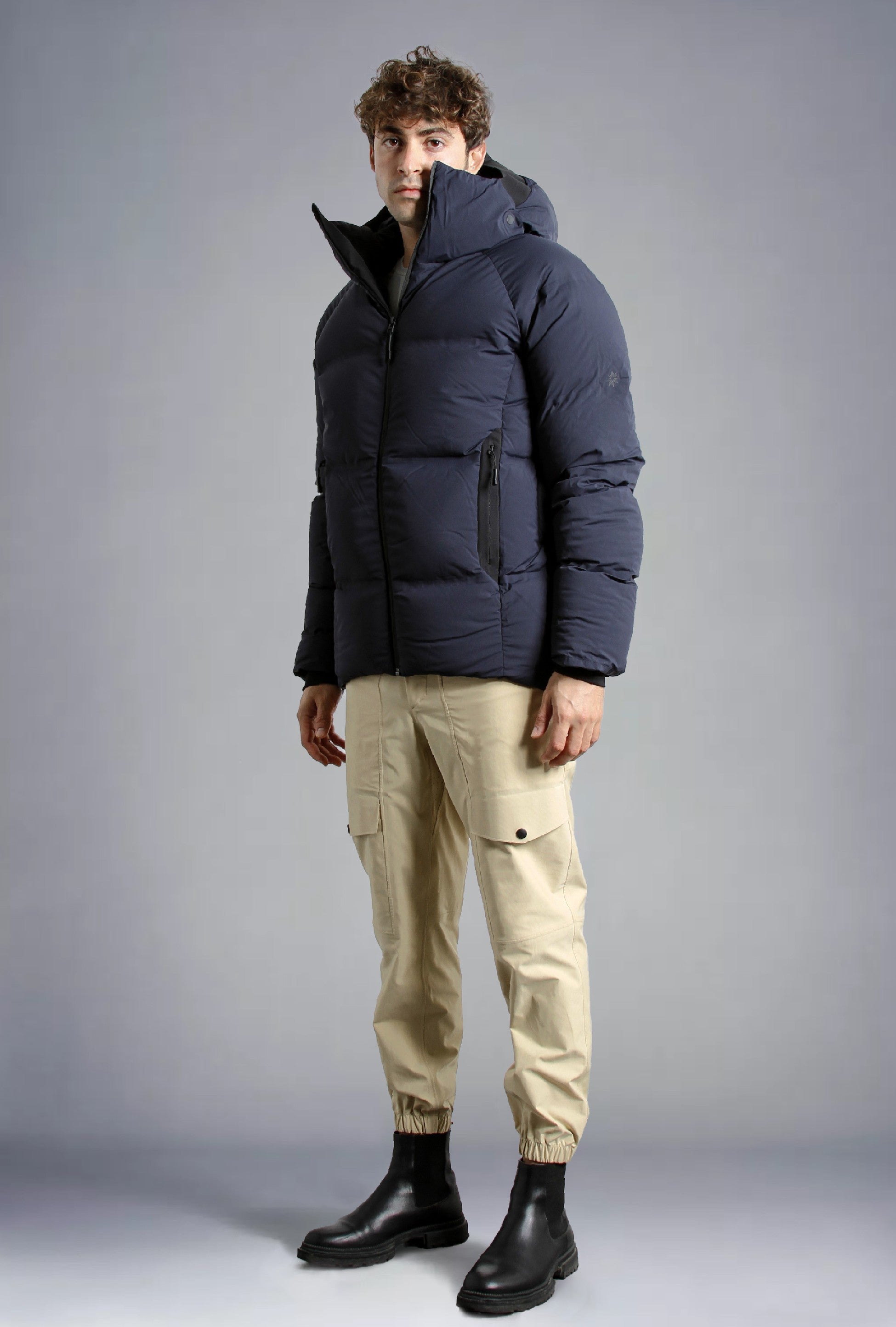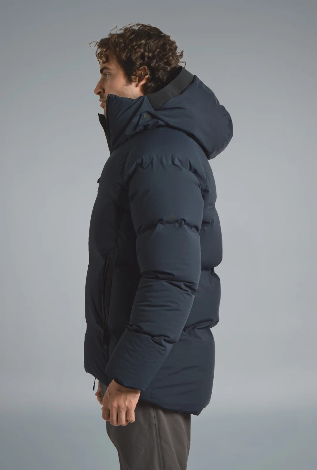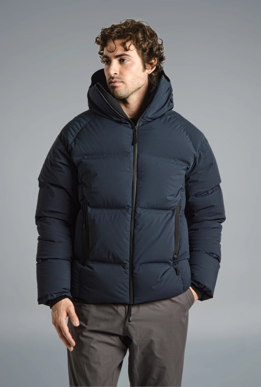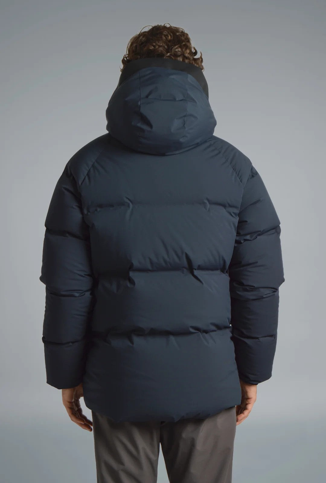 Beyaz kaz tüyü dolum ile başı saran kapüşon, patentli bir koahhaesive kordon kullanım sistemine sahip kaynaklı ergonomik bir sipere sahiptir ve tüm fermuarlar YKK aquaguard'dır .