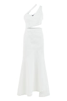 Discover the perfect blend of urban chic and inherent elegance with Jendue’s denim Ron dress. Featuring an asymmetric front and back , sultry neckline. A metallic zip fastening on side added functionality to this chic dress. Designed in white, this maxi dress is a standout piece for any occasion. This chis denim dress has a flare shape added flair. Adorned with a stylish side slit this dress epitomize modern elegance and versatility.