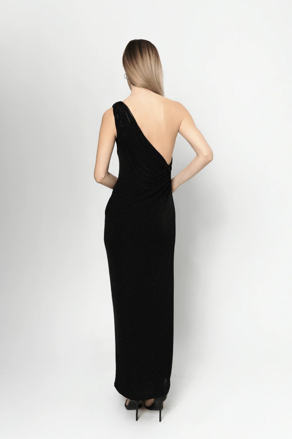 Elbisenin dikkat çekici detaylarından biri olan sırt dekoltesi, tasarımın sofistike ve modern çizgisini öne çıkarıyor. Sırt bölgesinde yer alan drape ve sallantılı taş detayları, etkileyici bir görünüm sunarak tüm bakışları üzerinize çekiyor. Bu elbise, kendine güvenen ve zarif kadınlar için ideal bir tercih.