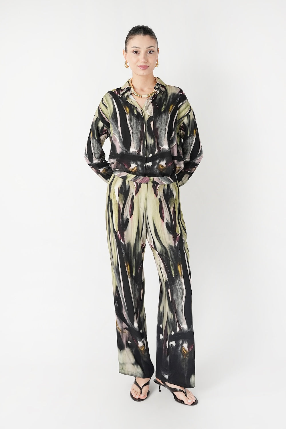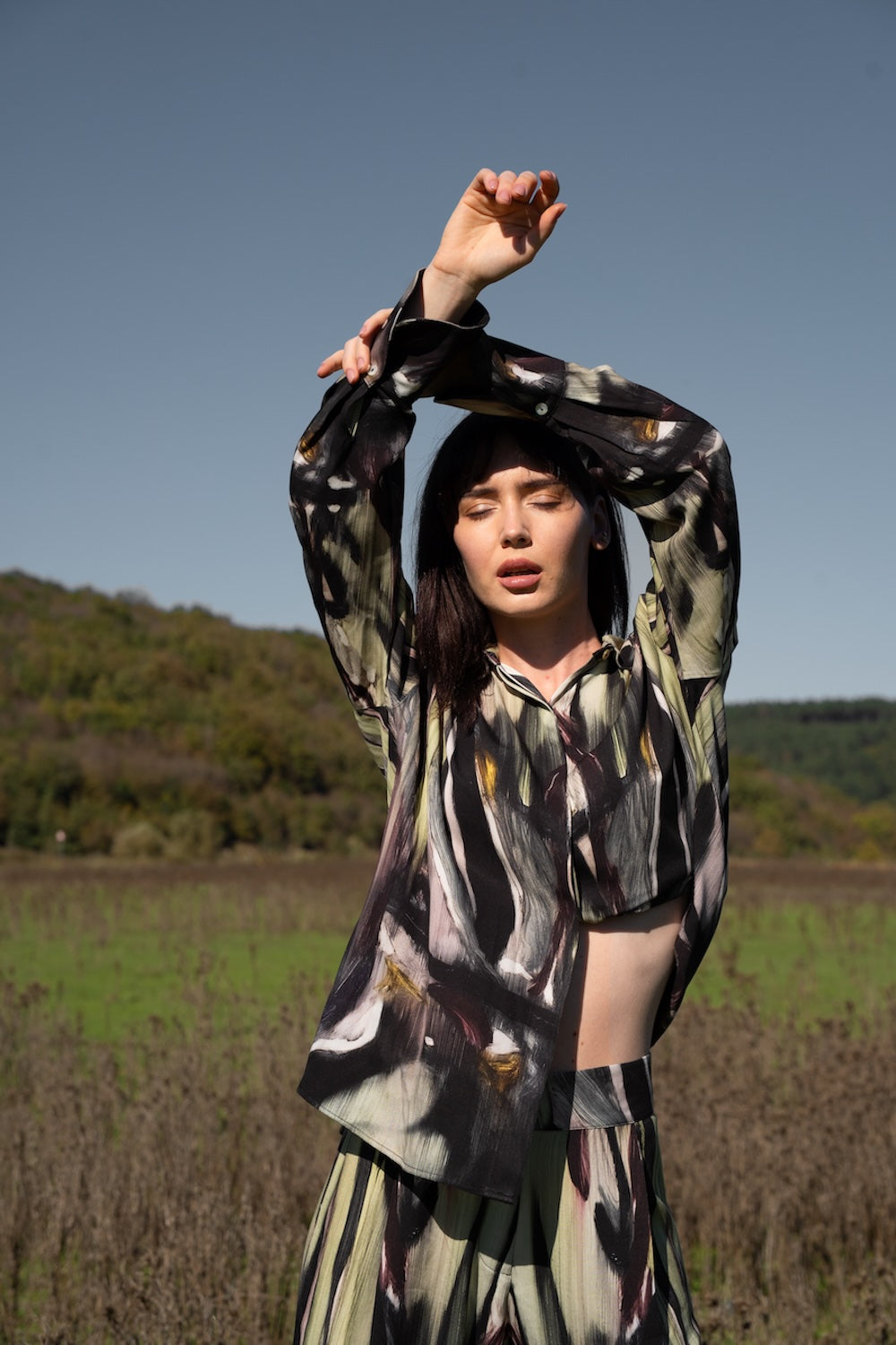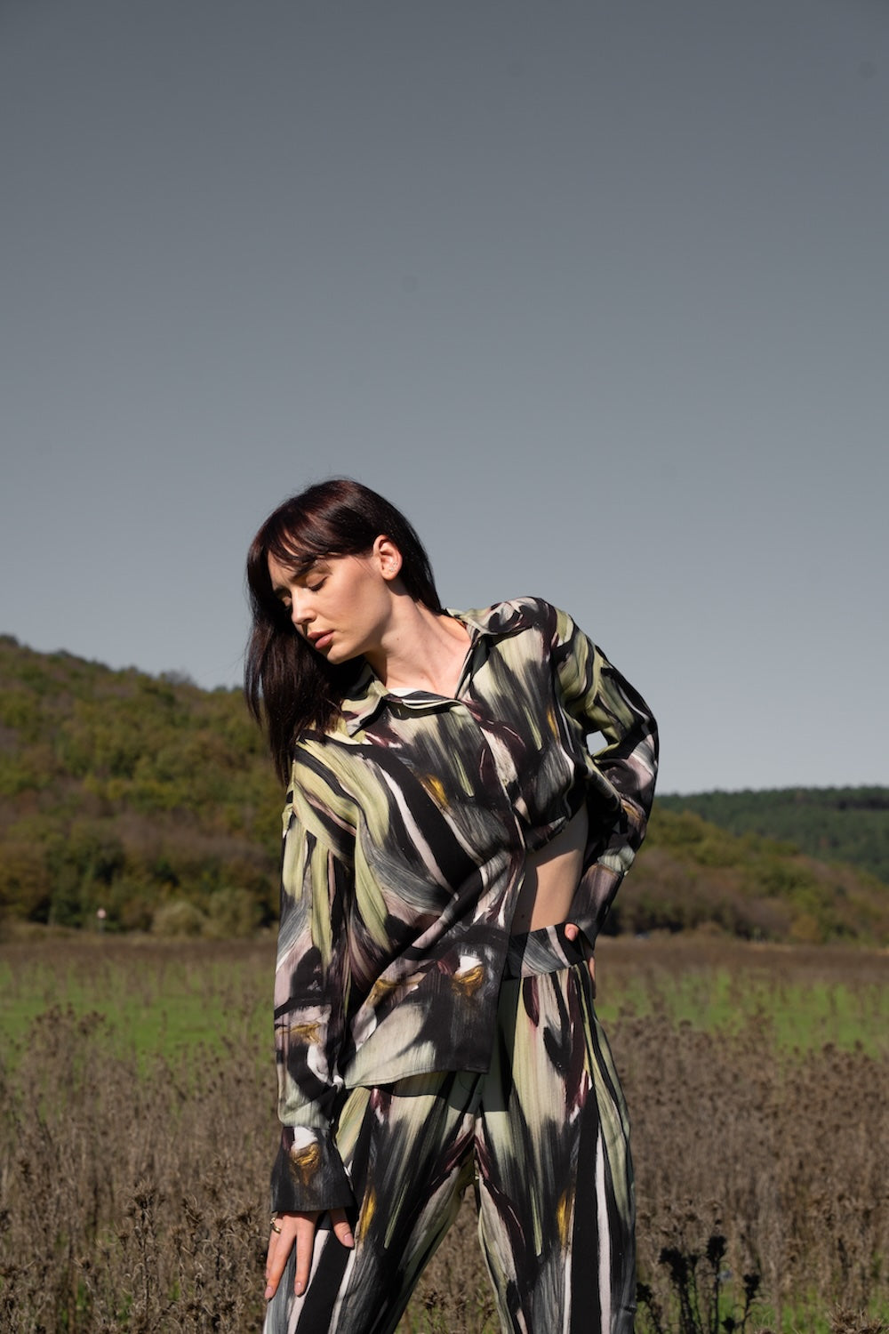 El boyası suluboya çizimlerinden ilham alan desenleriyle güçlü ve özgün bir görünüm sunar. Sanatsal dokusu, dijital baskı tekniğiyle pamuk kumaşa aktarılmıştır. Doğadan beslenen renkleri ve modern silueti sayesinde hem günlük kullanımda hem de şık kombinlerde rahatlıkla tercih edilebilir. Hafif ve nefes alabilen yapısı gün boyu konfor sağlar.