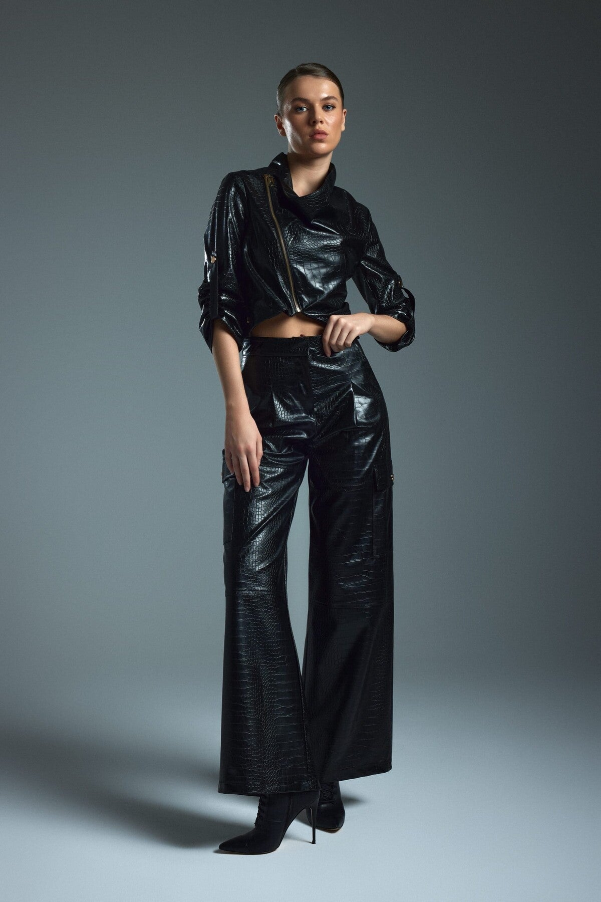 - İki parçalı takım: Asimetrik fermuarlı kısa ceket ve düz kesim pantolon