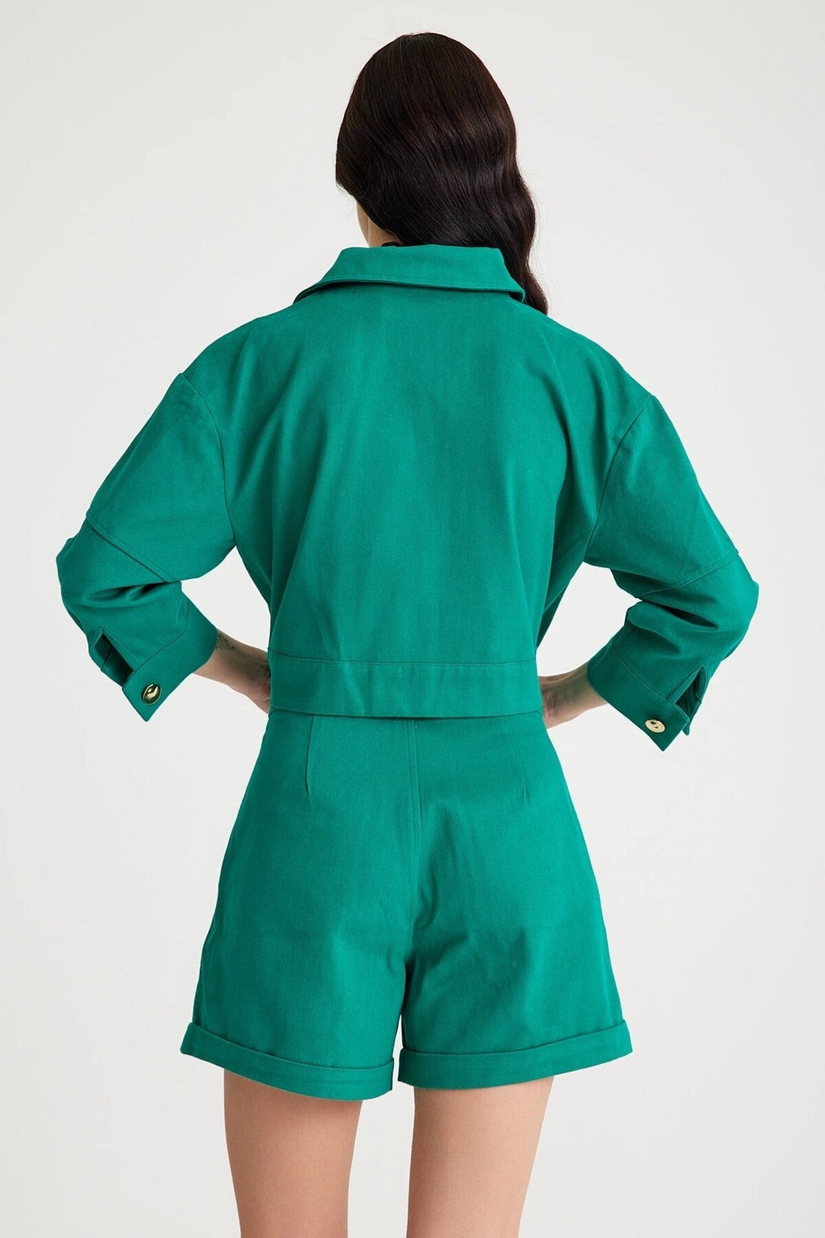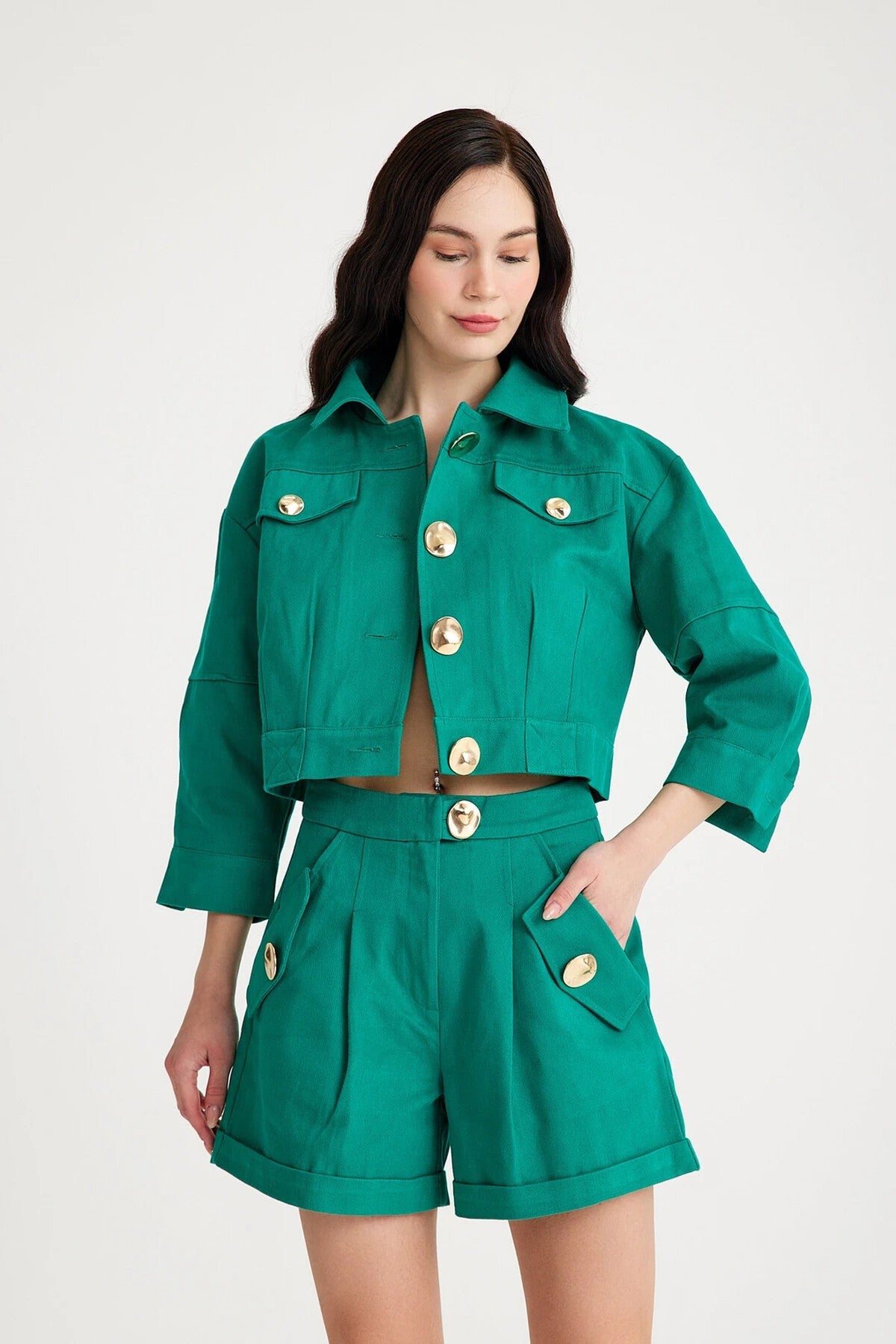 • Kısa ceket ve yüksek bel şorttan oluşan iki parçalı set