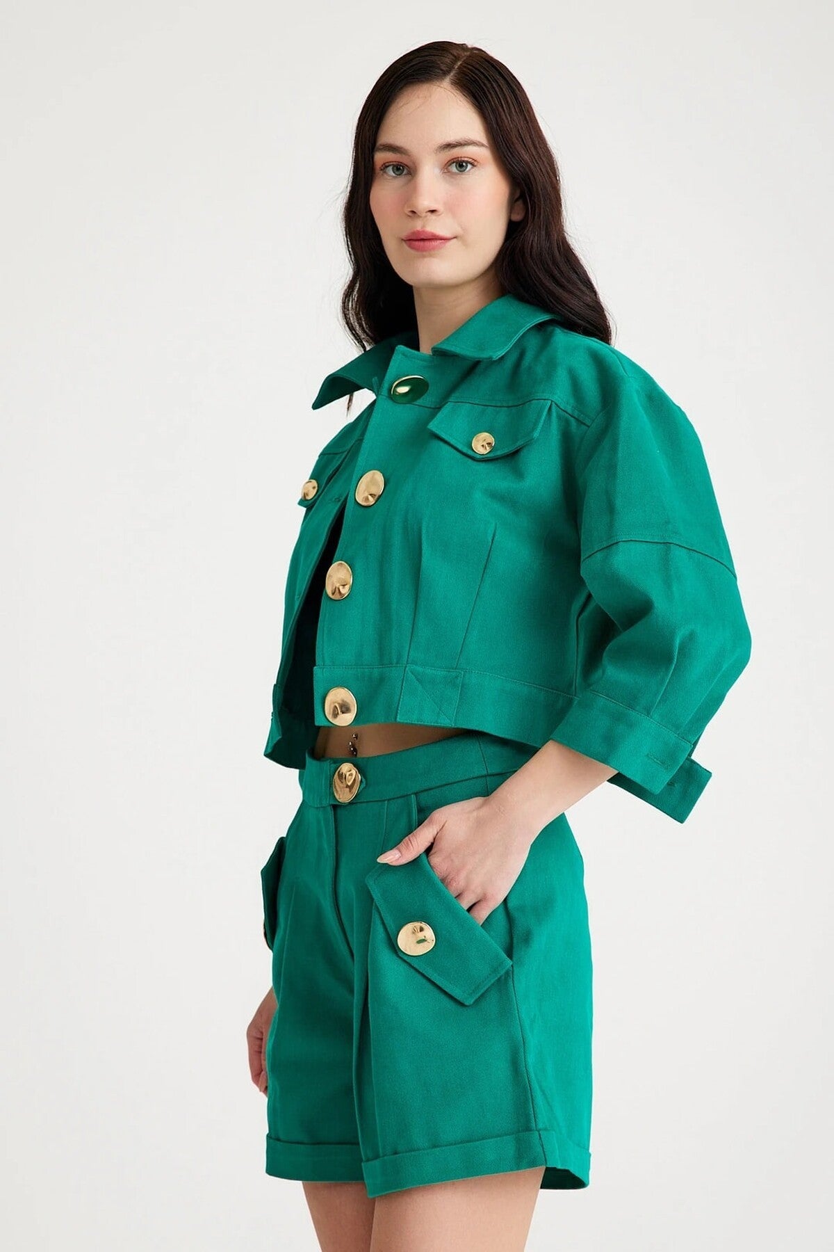 Güçlü bir stil ifadesi sunan bu ikili takım, büyük altın rengi düğme detaylarıyla cesur ve sofistike bir görünüm kazandırıyor. Kısa ceket formu, modern bir kesimle yapılandırılırken; yüksek bel şort ile birlikte dengeli ve iddialı bir siluet yaratıyor. Şıklığın ve özgüvenin buluştuğu bu set, özel buluşmalardan şehir stiline kadar pek çok alanda dikkat çekici bir alternatif sunuyor.