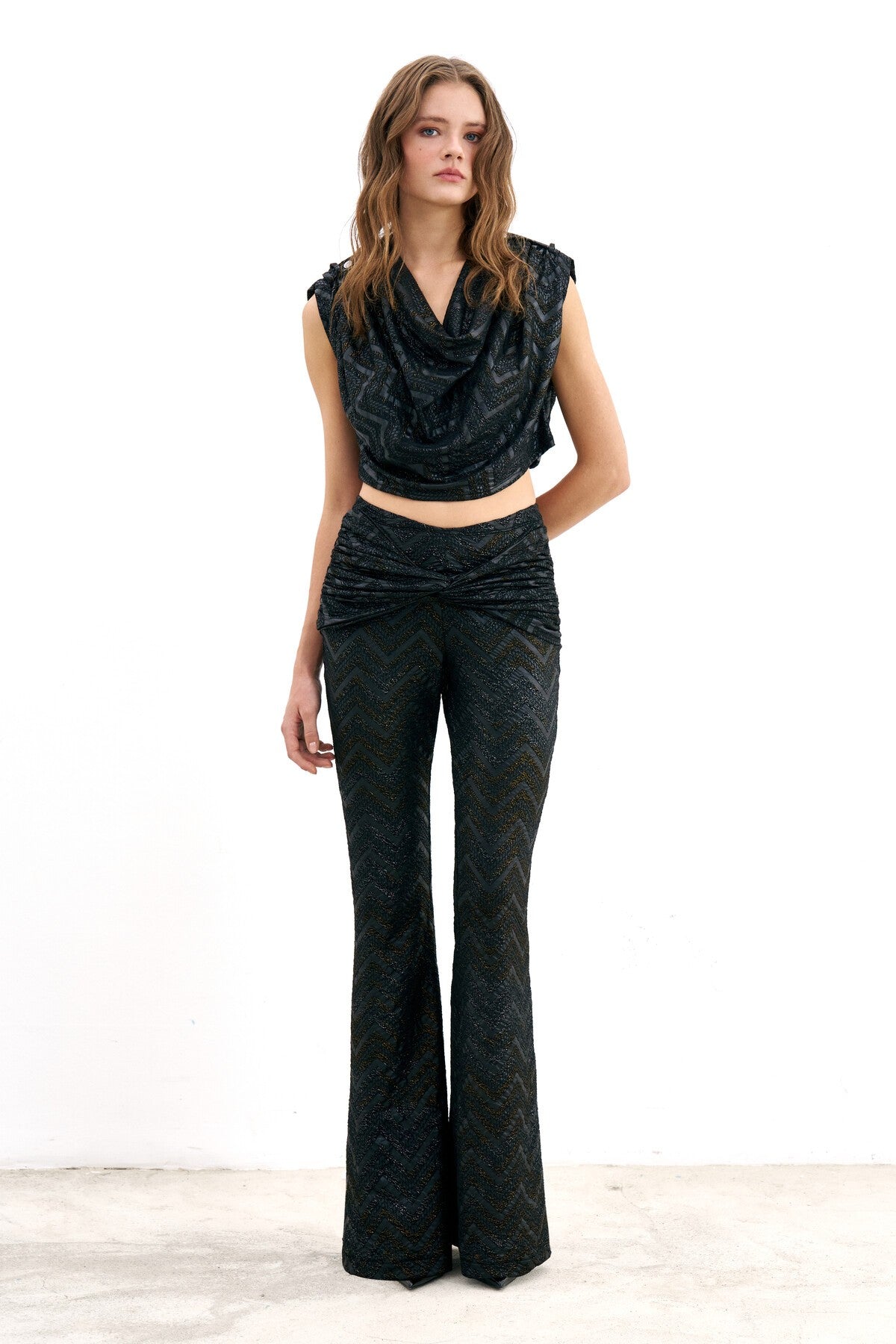 Modern ve iddialı bir stil sunan Zigzag Desenli, Beli Drape Detaylı Flare Pantolon & Degaje Crop Top Takım, özel davetler ve şık gündüz kombinleri için ideal bir parçadır. Flare pantolon, beli drape detayı ile feminen bir siluet yaratırken, zigzag deseni tasarıma dinamik ve trend bir dokunuş katar.