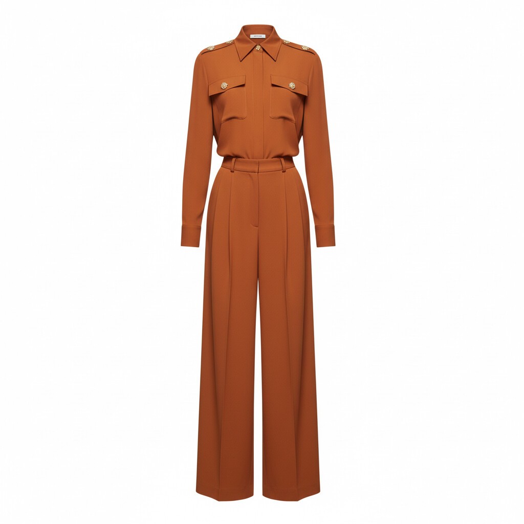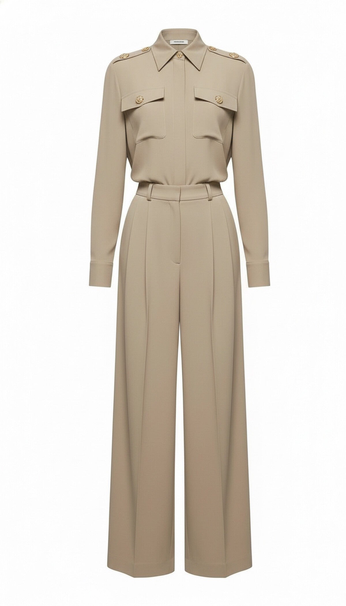 Zamansız şıklığı modern detaylarla buluşturan Cep Detaylı Gold Düğme Aksesuarli Krep Kumaş Çift Pileli Palazzo Pantolon, hem ofis kombinleri hem de şık günlük stiller için ideal bir parçadır. Çift pile detayı pantolona hacim ve hareket kazandırırken, palazzo kesimi rahat ve akıcı bir siluet oluşturur.